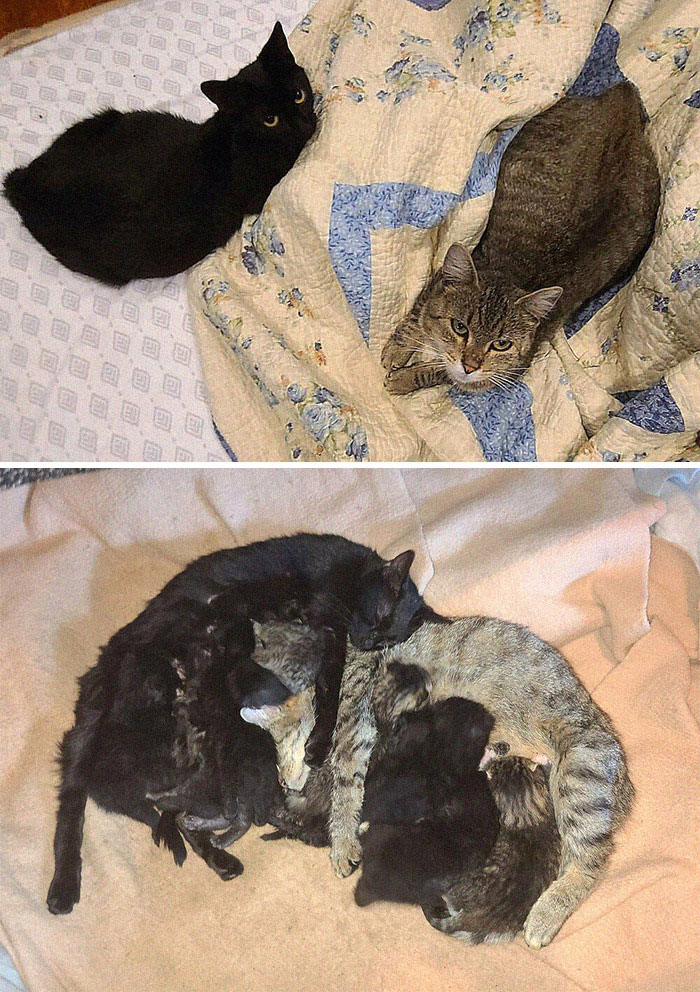 Bree from Maine, USA fostered two pregnant cats. When they gave birth they took care of each other’s kittens