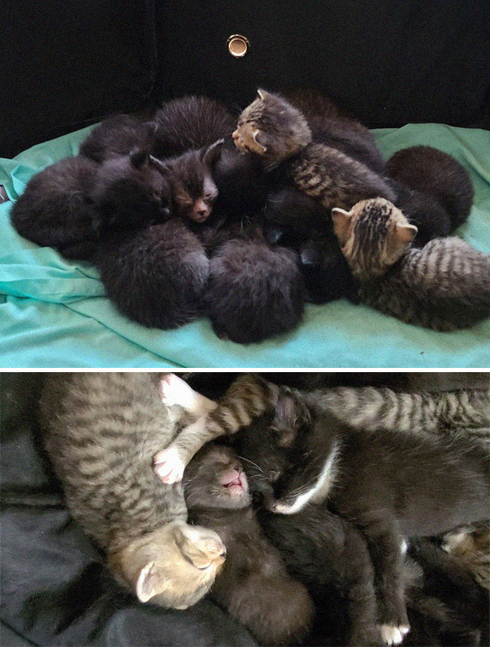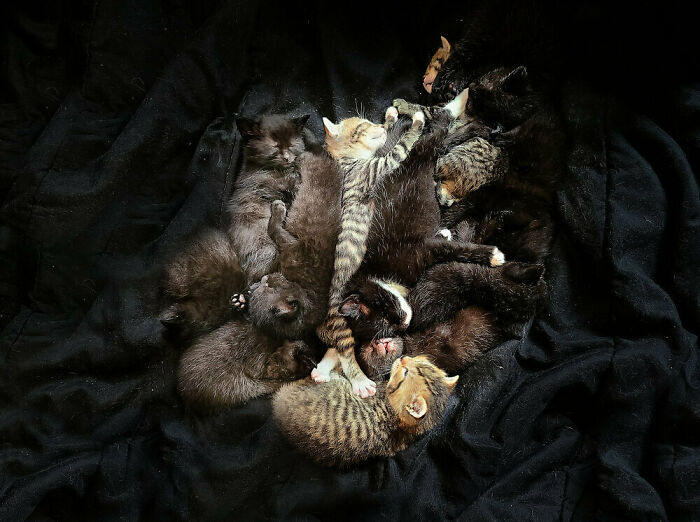 “I decided to foster 2 pregnant cats found at a colony site together. They each had their babies 6 days apart and after a week, the two moms joined together and started to raise all 12 babies as one big family. They took care of each other’s babies as if they were all their own.”