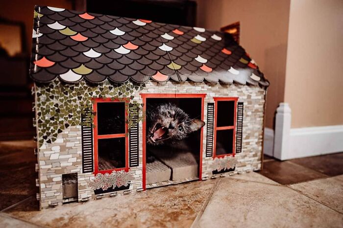 Bree told us more about Gracie’s personality: “Gracie rides in the car now and visits her grammies house! She has a bubble backpack that her grammie bought her that she rides in! When Gracie is not adventuring, her bubble backpack is her playhouse. She is not very talkative at all. She loves to come up to my feet when I’m sitting and rub on them and almost hug them. Gracie does not sleep with me, she sleeps on the couch typically. She loves to chase her own tail and sit in the window. Gracie loves to scratch on her scratching boards and she loves to nap.”