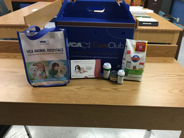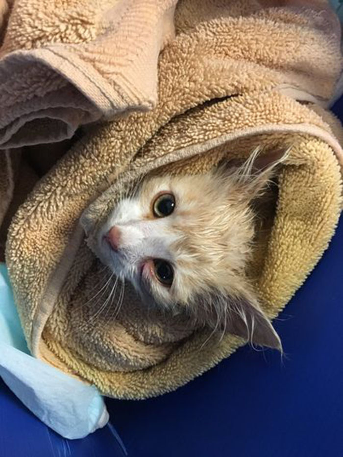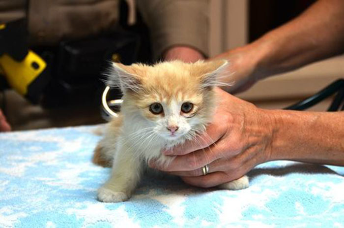 The officers blocked one lane of traffic while they safely retrieved the cat from his hiding spot. VCA Madera Pet Hospital in Corte Madera agreed to take a look at Bridges, so his new pal, Officer Smith, took him right over. The kind staff doted on the kitten, giving him a thorough exam and a much-needed bath – for free!