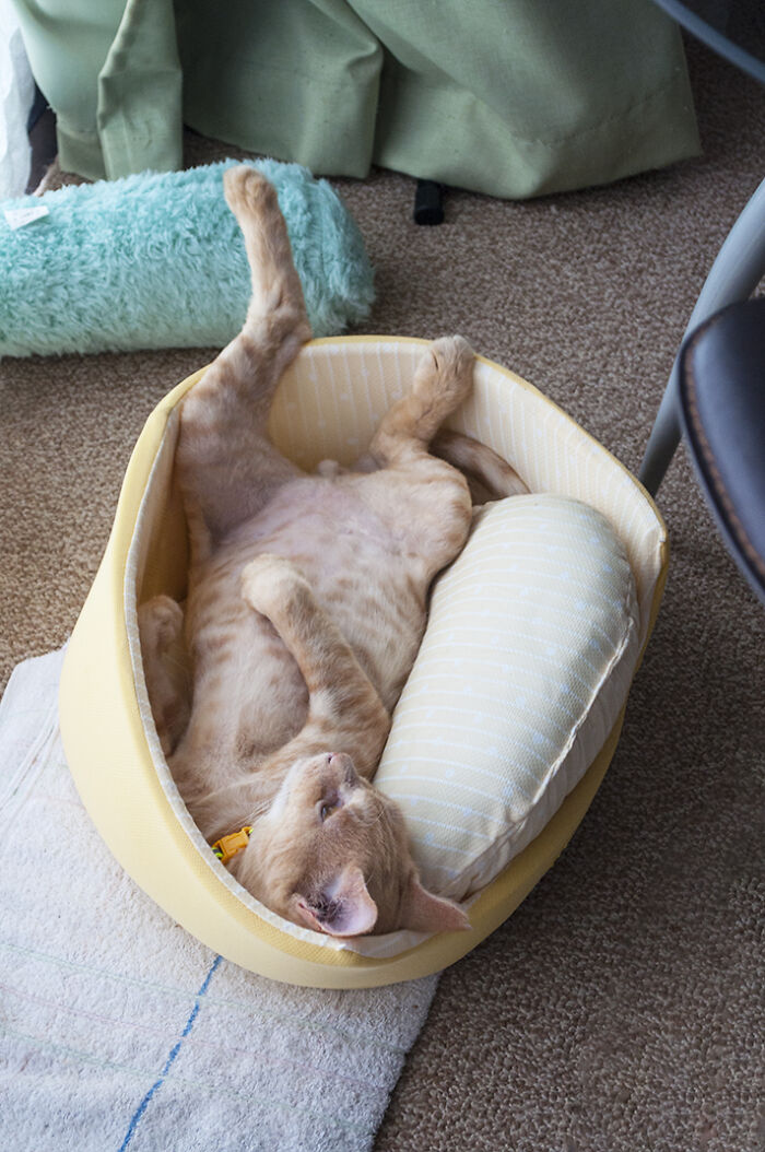 30 days in we gave him a little blue cushion, which seemed to give him real comfort