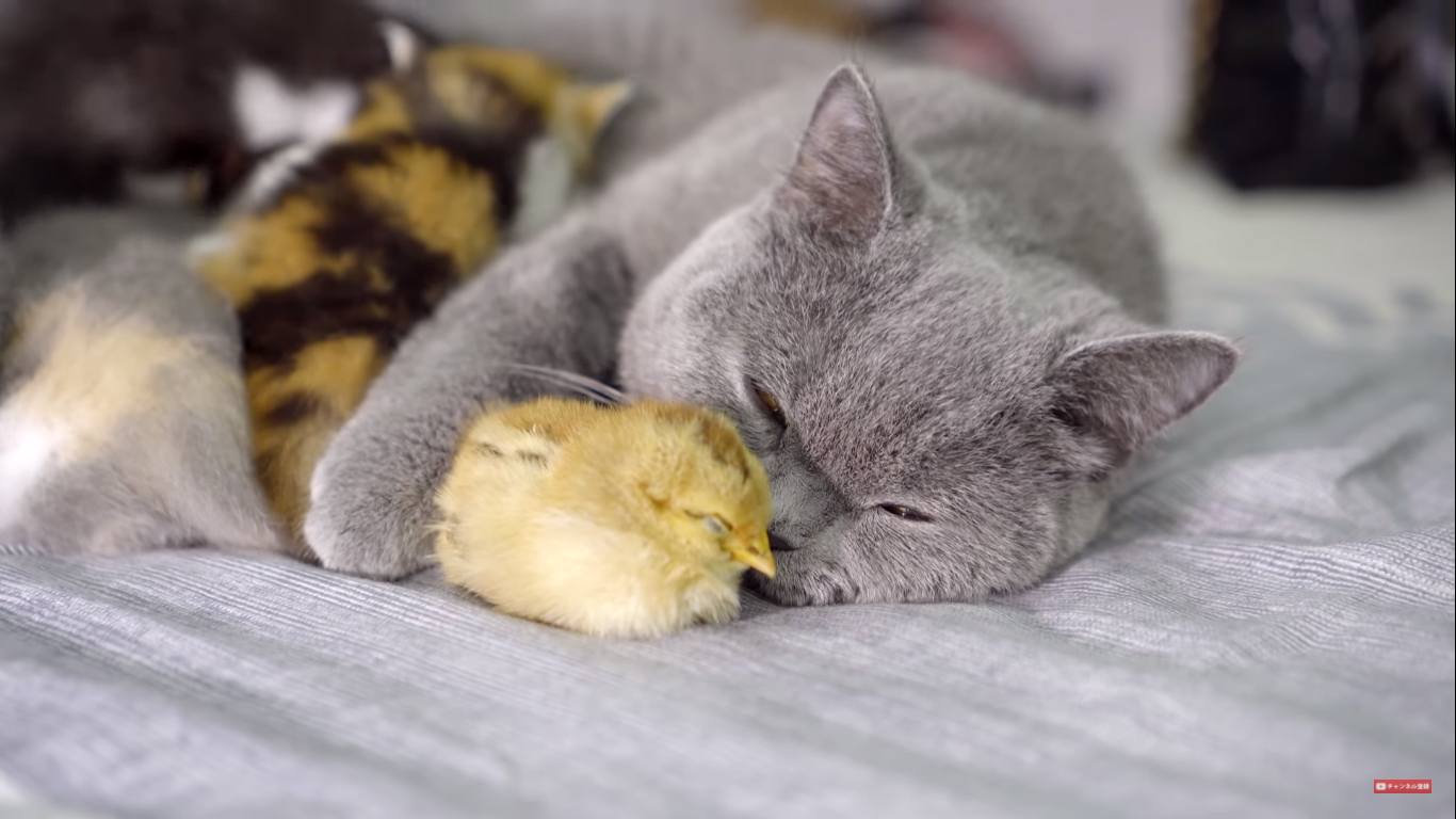 In the short yet sweet video, the yellow chick is enjoying a great nap with his besties. They care for each other, they cuddle together to keep each other’s warm. And when the cat mom affectionately licks her baby, she doesn’t forget to take care of her adopted kid. Isn’t this girl wonderful?