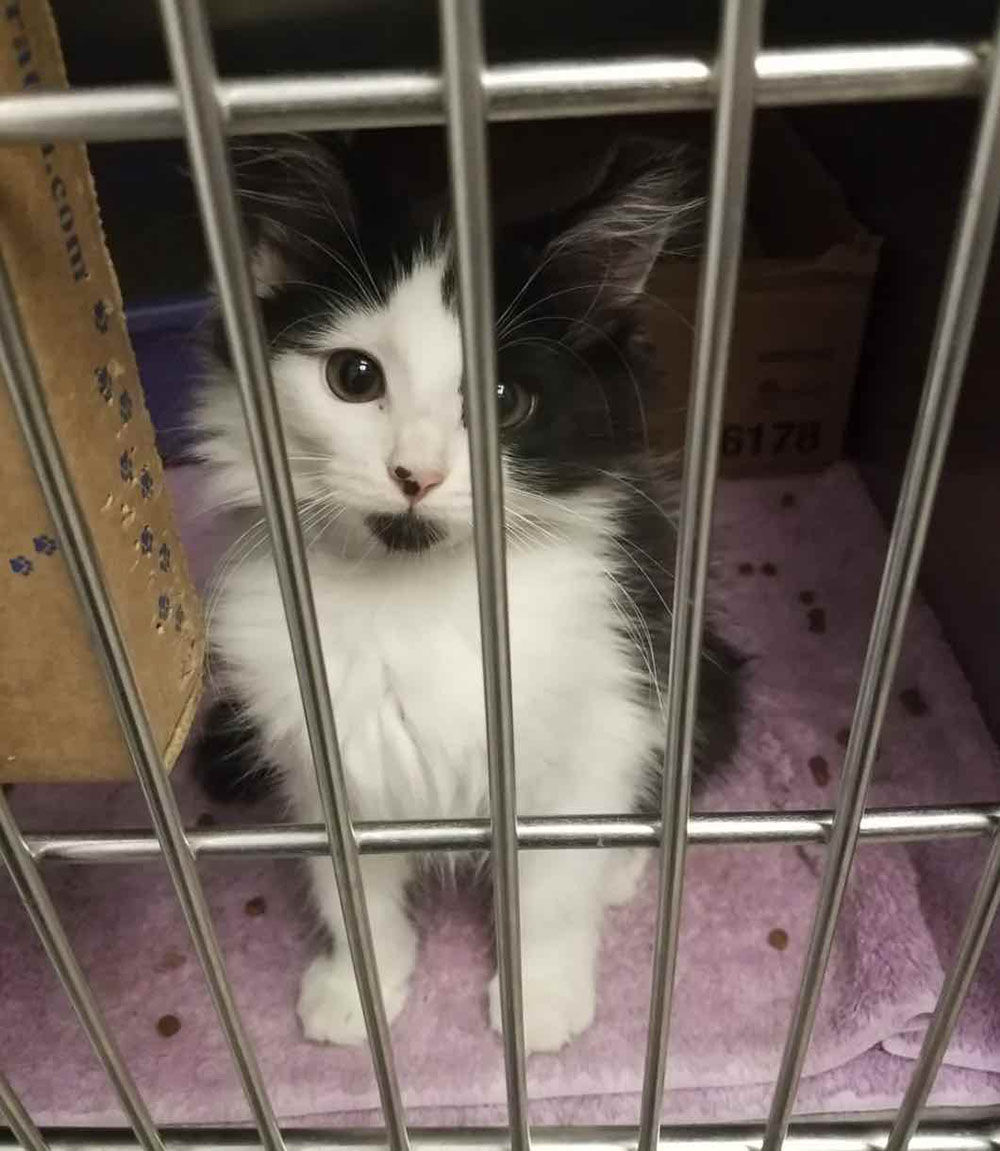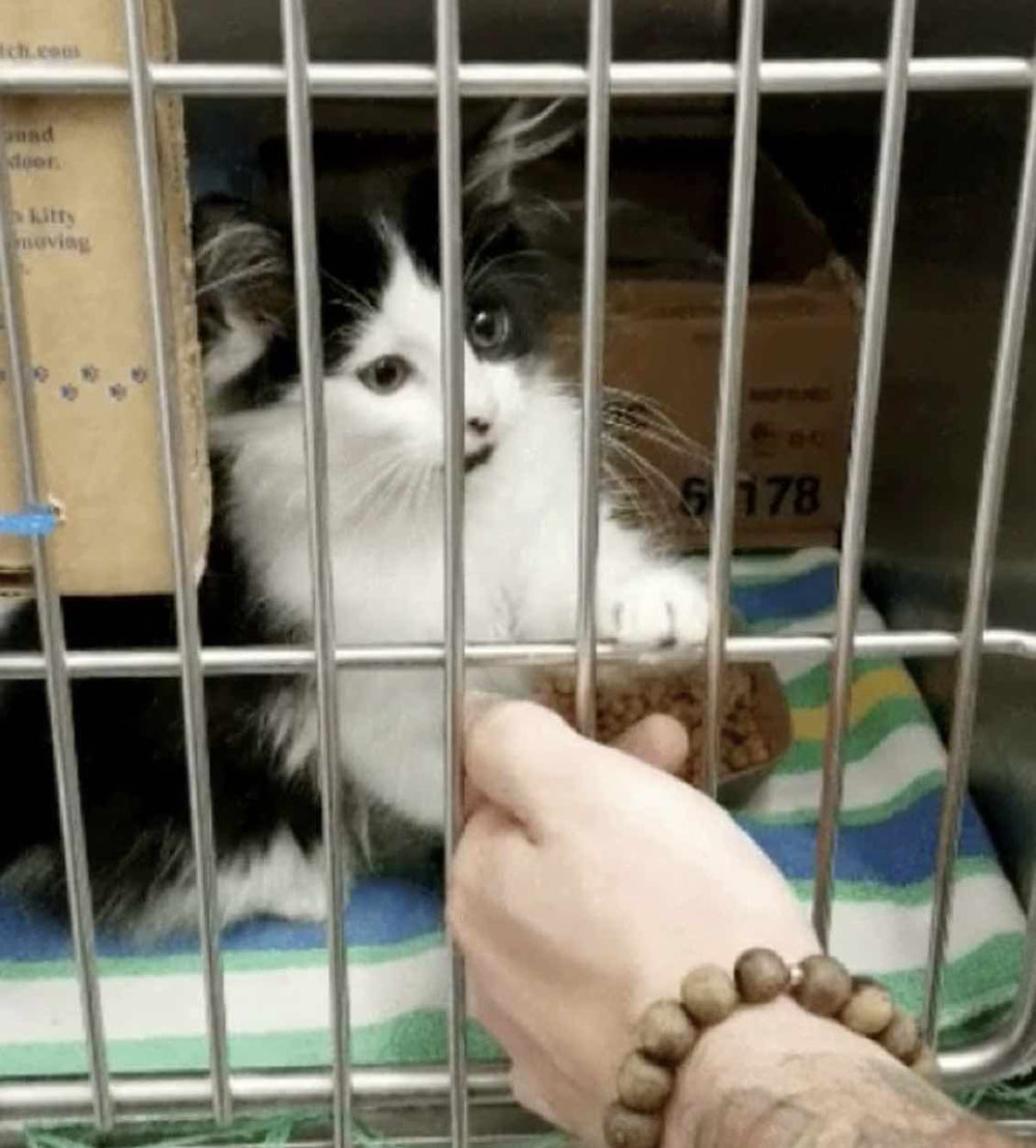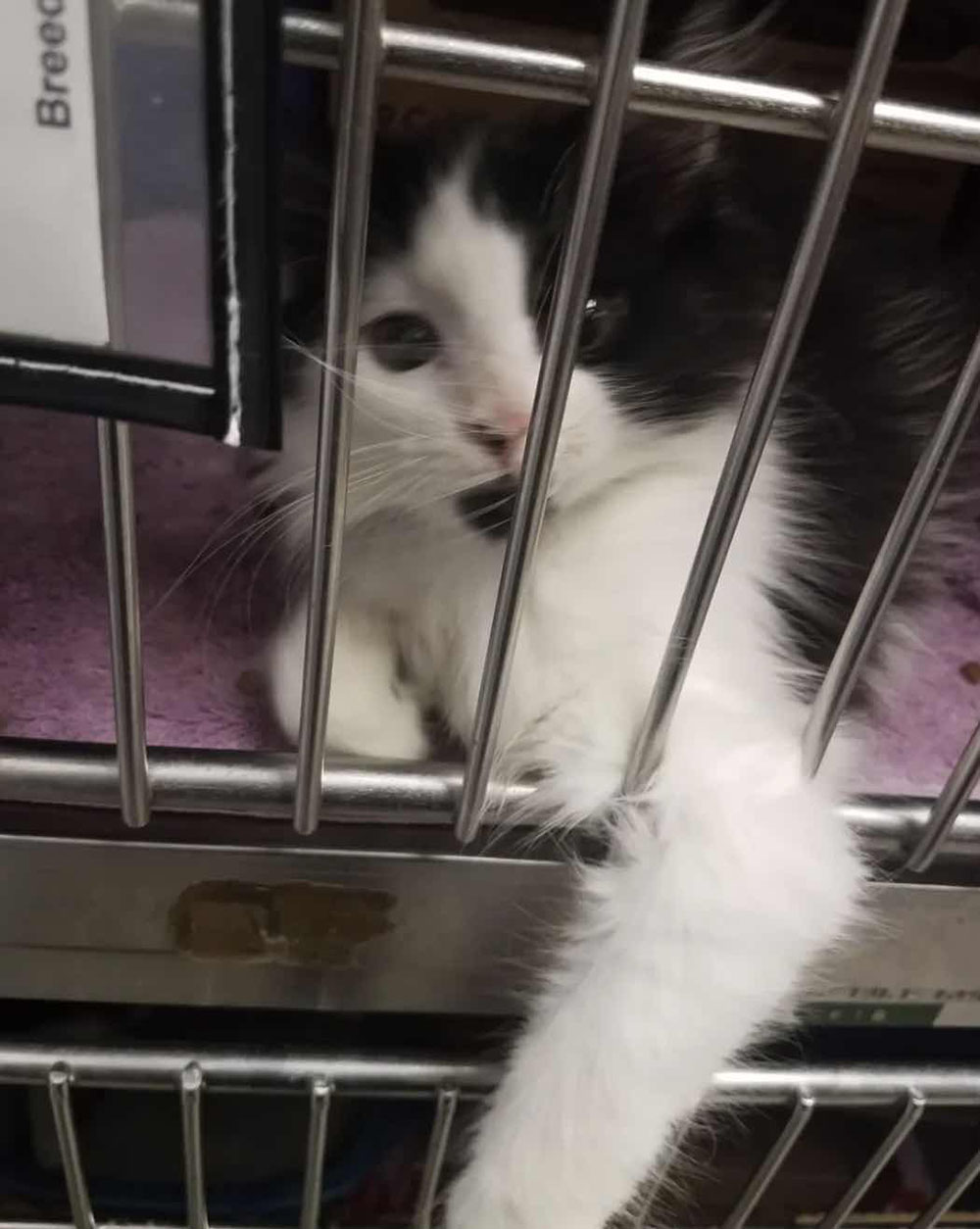 This fluffy kitten began meowing and pawing at the cage to get their attention.