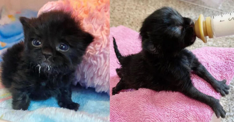 The kitten whose eyes hadn’t opened, was in need of critical care. Dannielle rushed to pick her up and brought her home. “Despite her situation, she was in good spirits.”