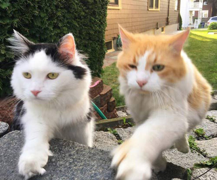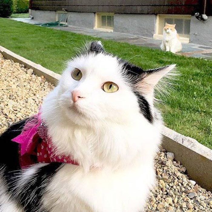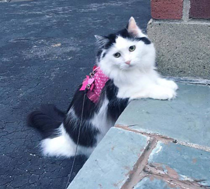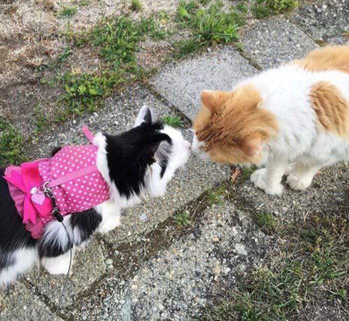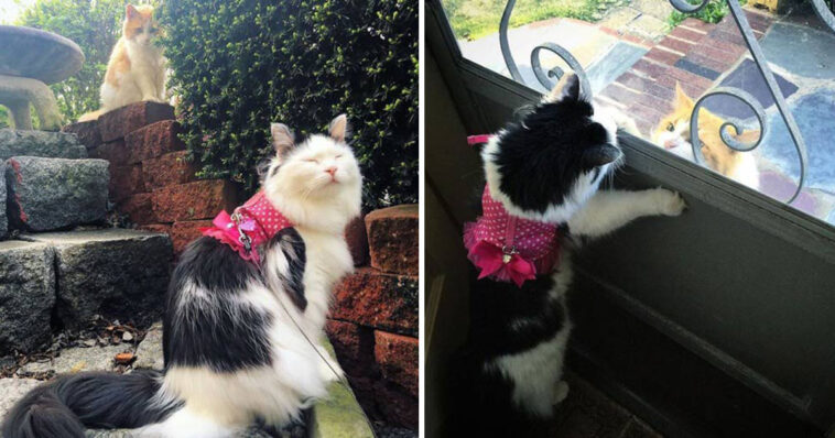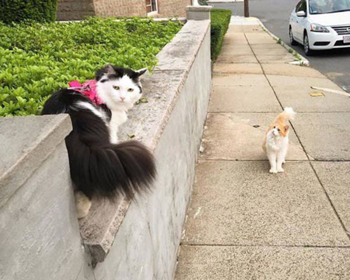 Sophie is a rescue cat and was adopted back in 2014. “I remember when I first started taking her out on the leash, Scottie would come over and watch from across the lawn or driveway without coming too close,” says Sophie’s human mama.