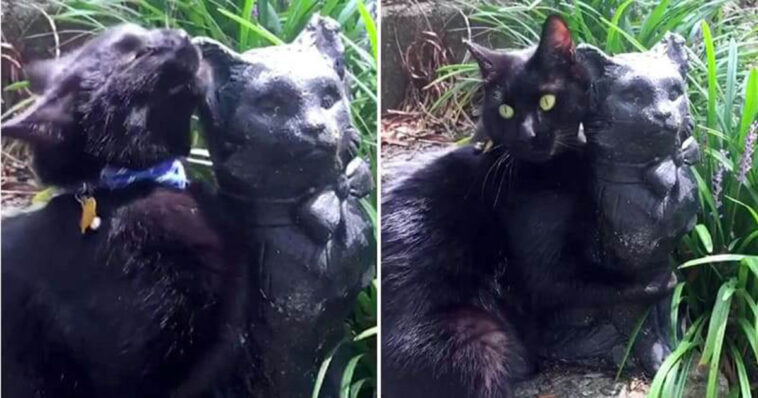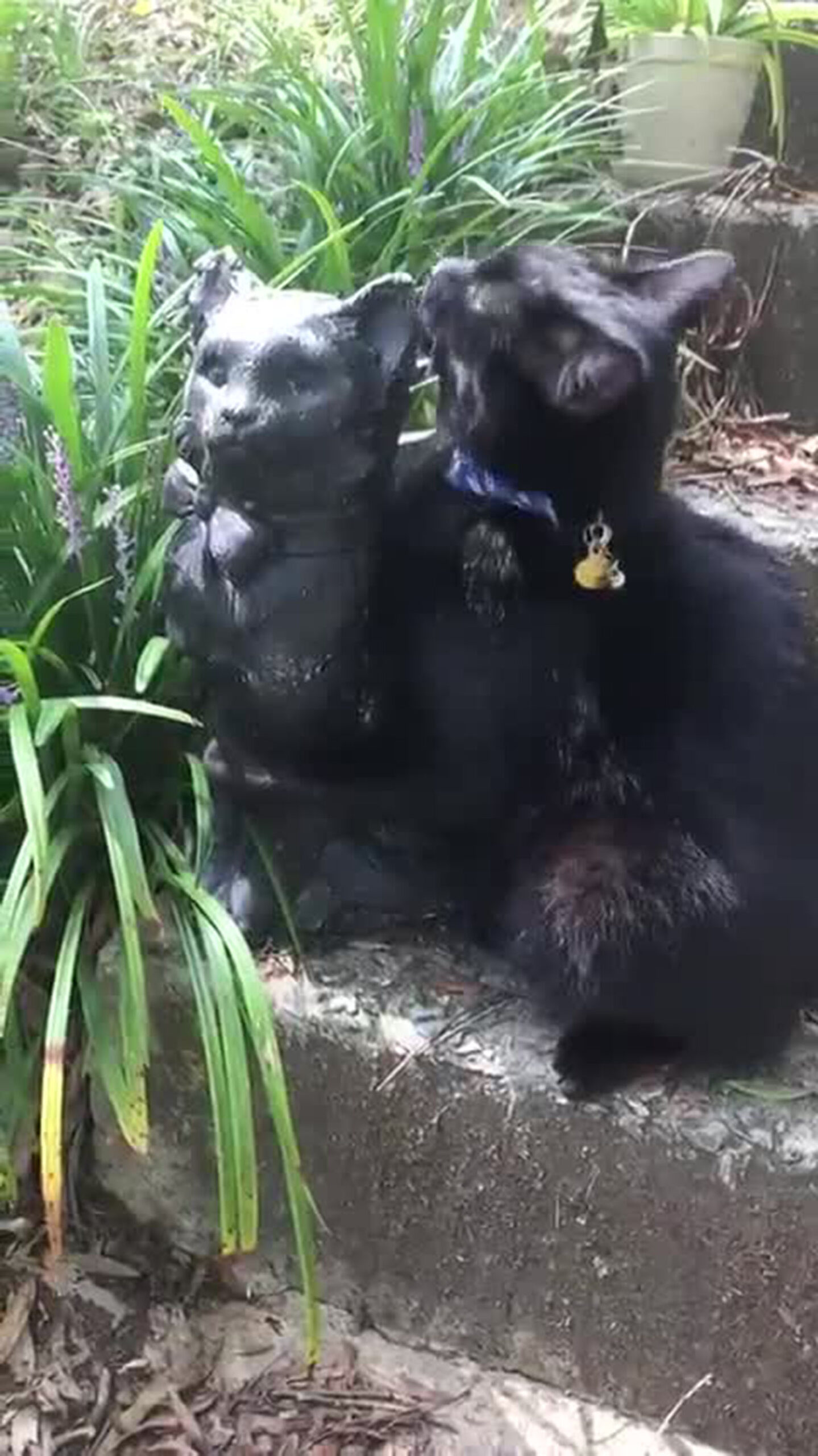 One day, Cosmo was sitting outside with Salzer when he spotted the statue. After seeing the cat statue, the cat was immediately attracted to his strange twin. He started sniffing the stone and cuddling with it.