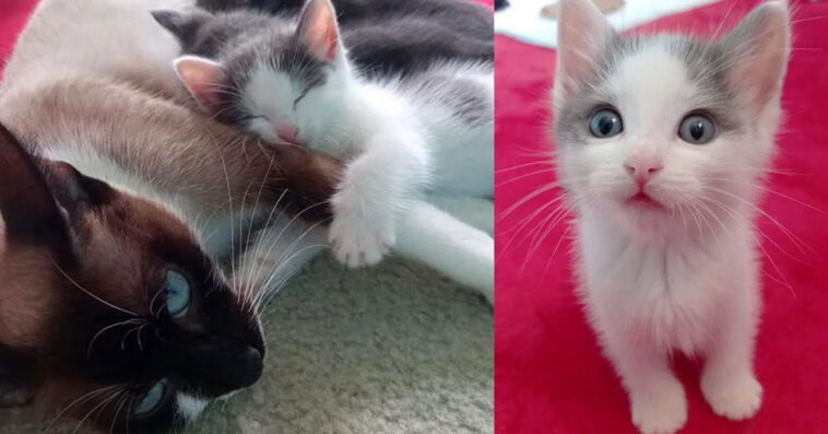 A kitten was found all alone but a cat took him in and made him part of her family.