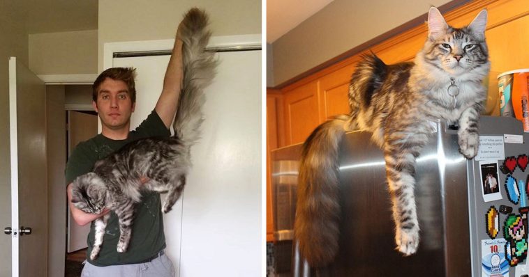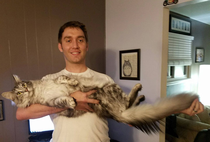 This is Cygnus. He is a Maine Coon from Detroit, Michigan. He is 15 lbs, and just turned one. His tail measures 18.4 inches, from tail base to end of skin. But, if you count the fluff, it’s 24 inches long. The most shocking part is that it’s still not done growing….