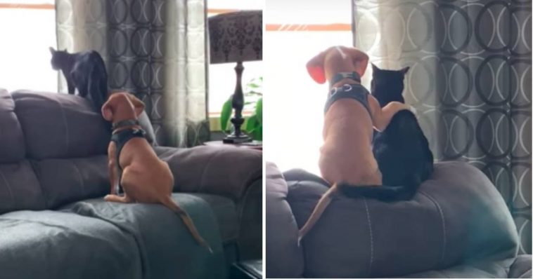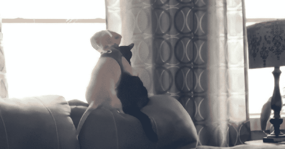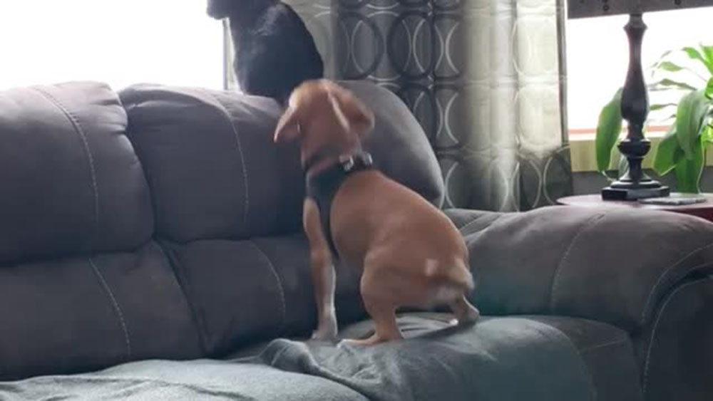 Bo, a 5-month-old beagle, can be seen in the clip climbing up a sofa to join 10-month-old chubby black cat Jasper as they stare out the window to watch birds together.