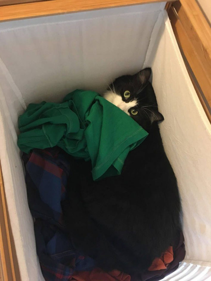 “He discovered that there’s nothing more satisfying than hiding out in the hamper,” his human said. “He really loves it in there.”