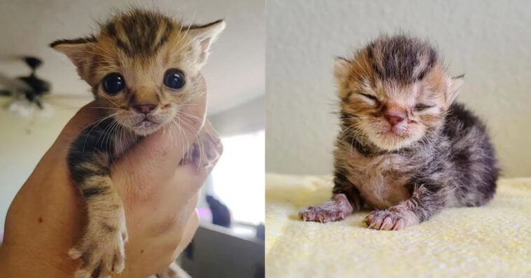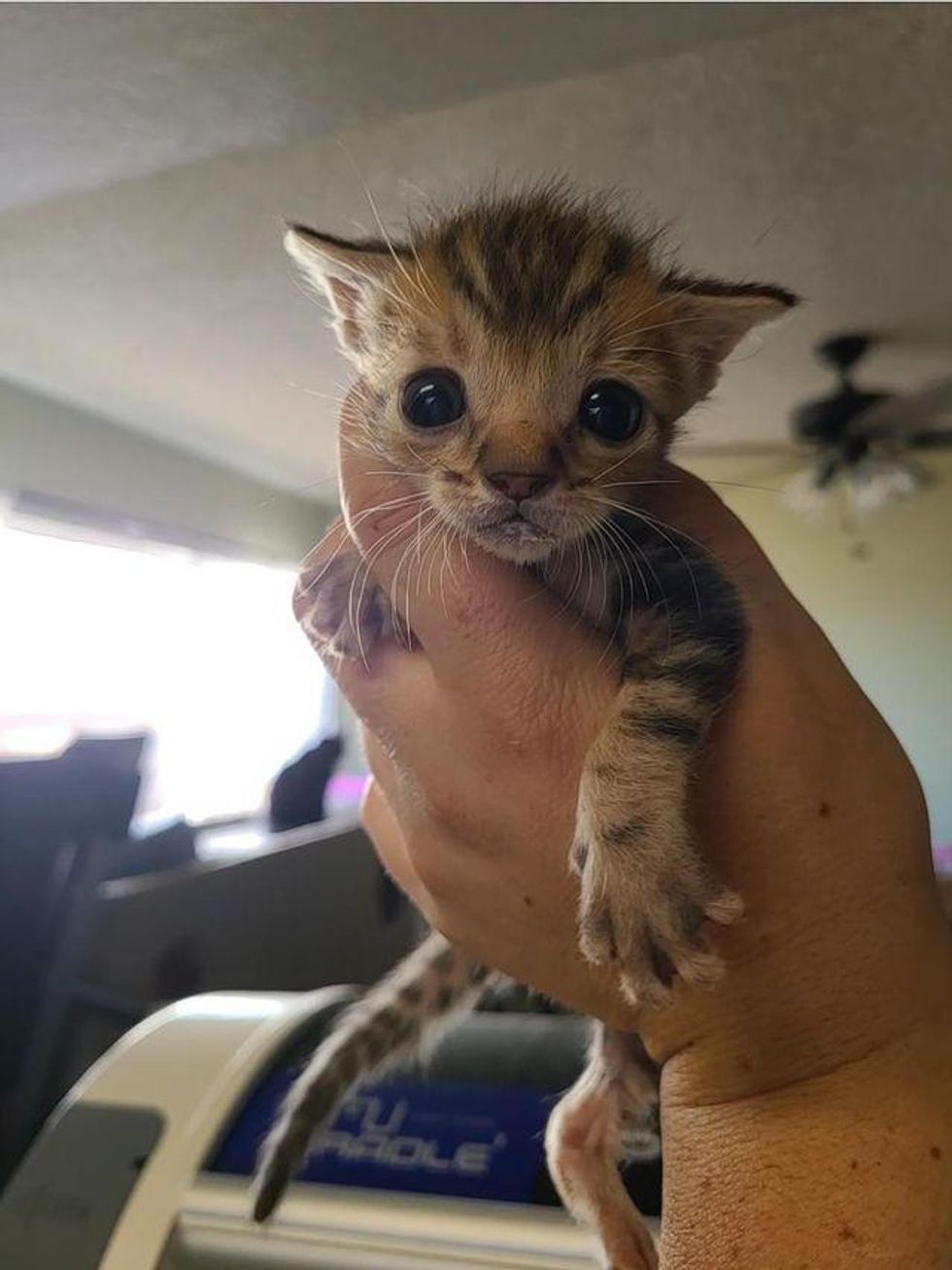 A two-day old kitten was brought to a local shelter in Phoenix, Arizona, in need of help. He was missing a paw as one of his hind legs was found tangled in straw.