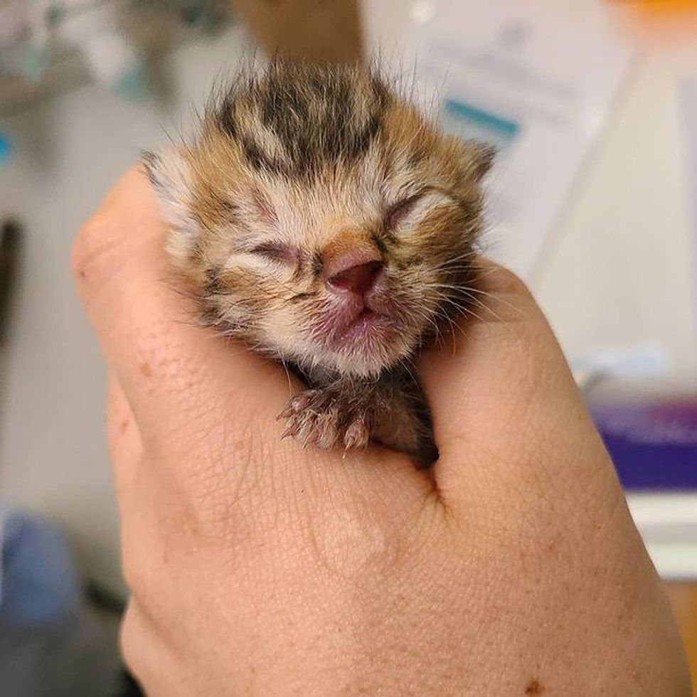 With a severely infected leg and barely any energy to suckle, they weren’t sure if the kitten would make it through his first night. Despite being so frail, he let out a few tiny squeaks when he was petted, as if to say he wanted to live.