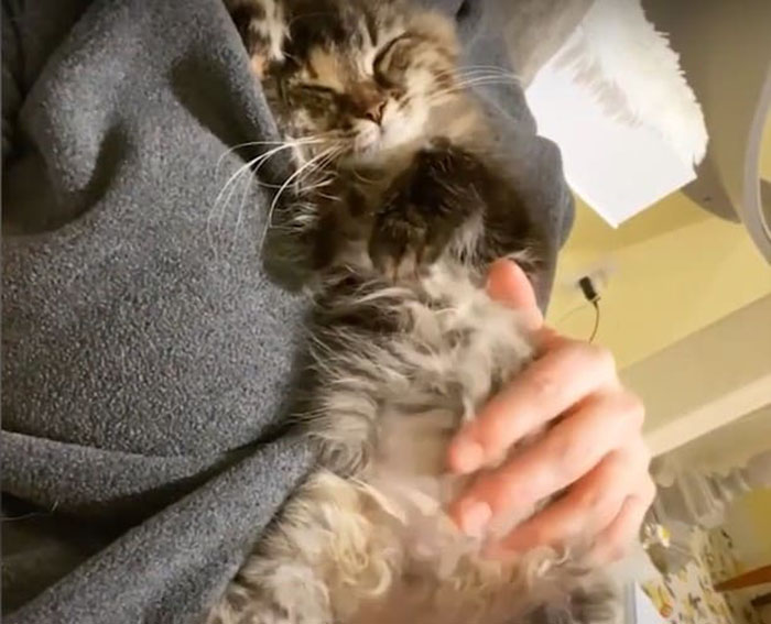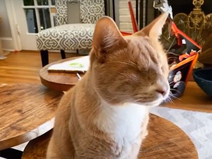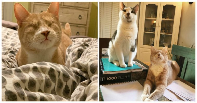 Despite having no eyes, the cheerful boy did make a great impression on Jen and Ian when they first met. “I saw this tiny little kitten who had just had his eyes removed. And he was wearing a cone, sitting in his cage, all by himself trying to eat out of a bowl of food”, said Jen. Having her heart broken by that scene, Jen thought the little cat could get more food and better care at home. So the couple decided to take him home and care for him.