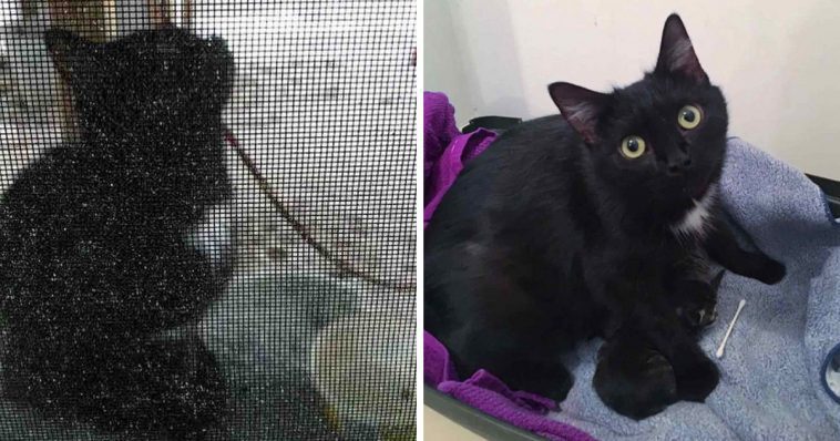 A stray cat appeared on the doorstep every day, waiting patiently until the kind homeowner gave her some food.