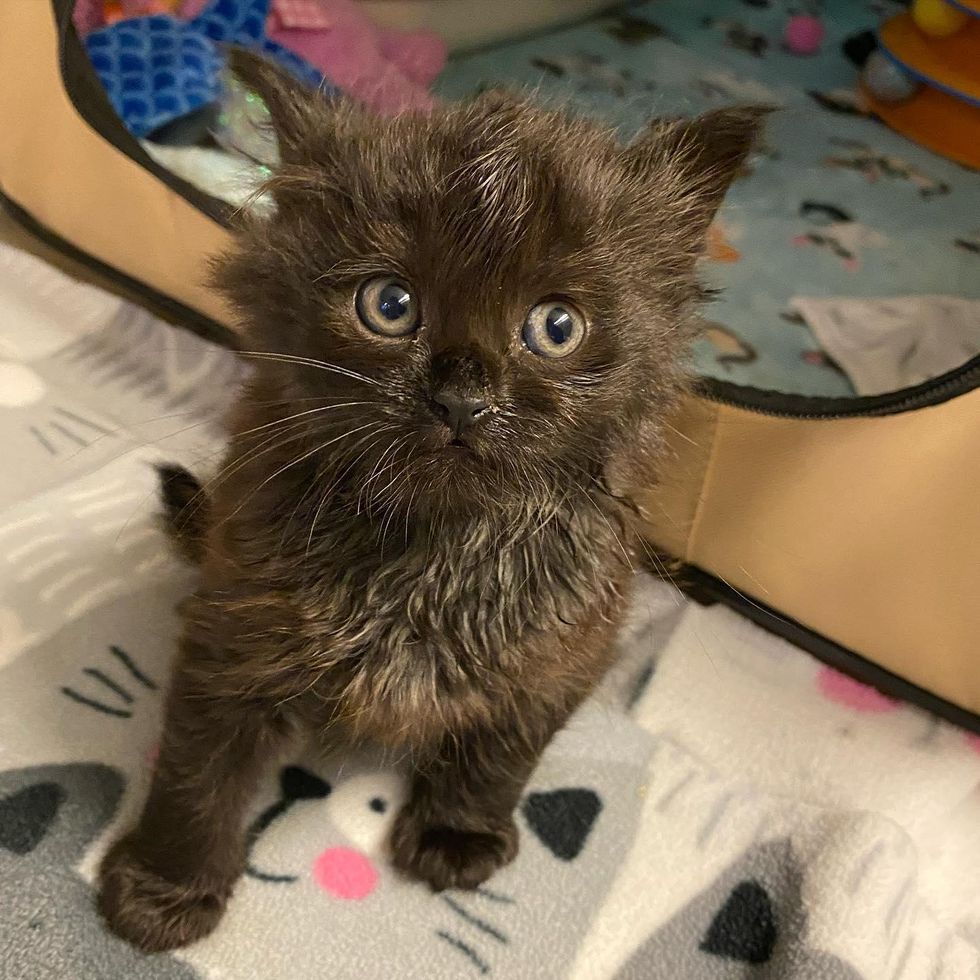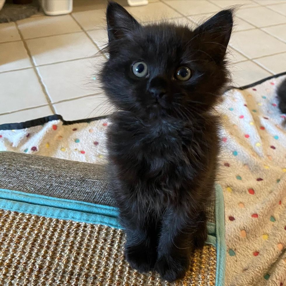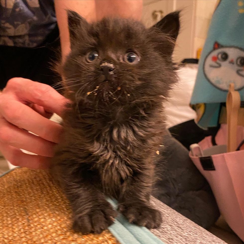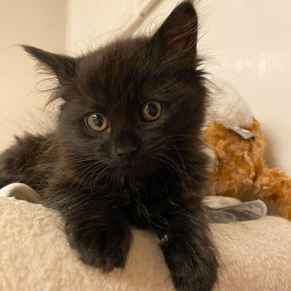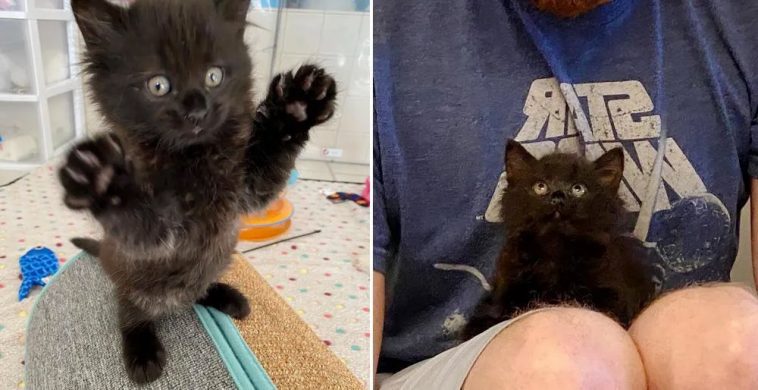 A few weeks ago, a little black kitten was brought into Mini Cat Town, a cat rescue in San Jose, California, after he was rescued as a singleton. The kitten with a pair of big doe eyes and bear mittens, was an instant love-bug.