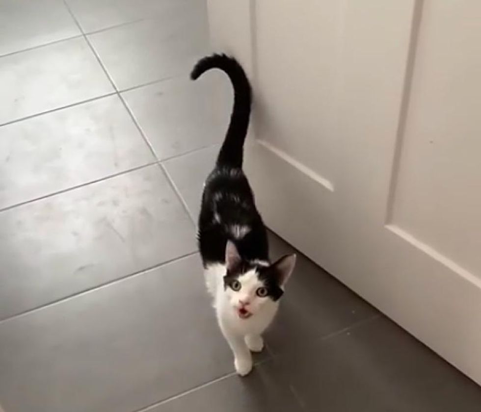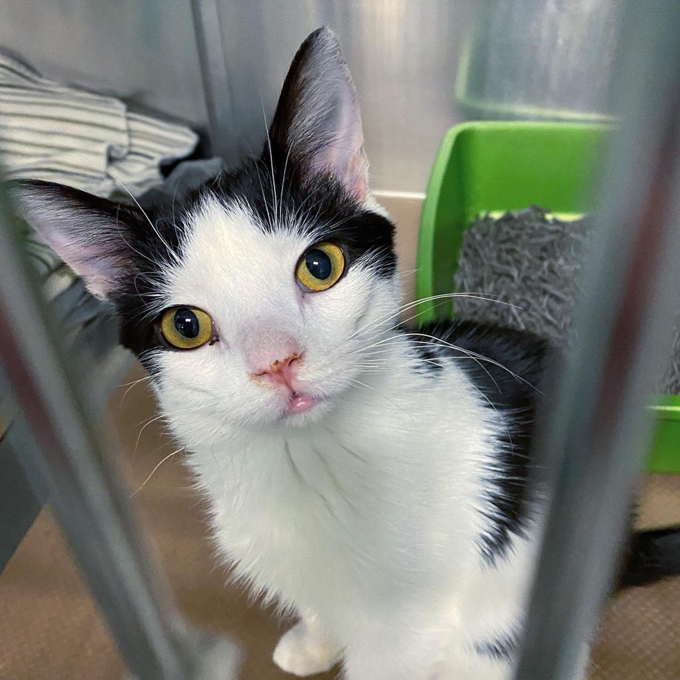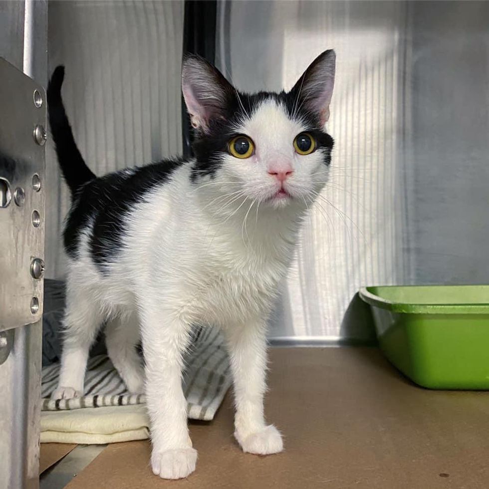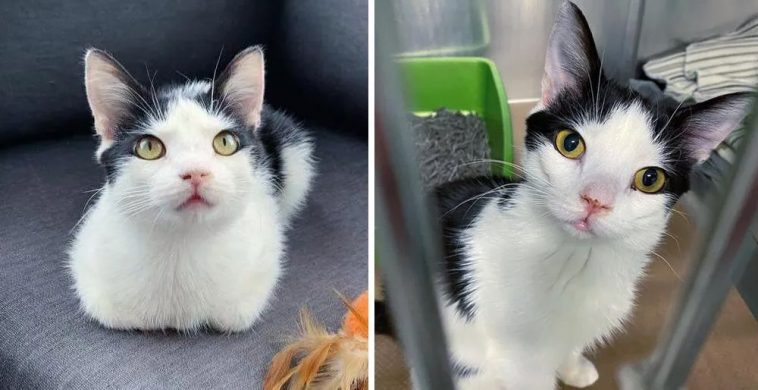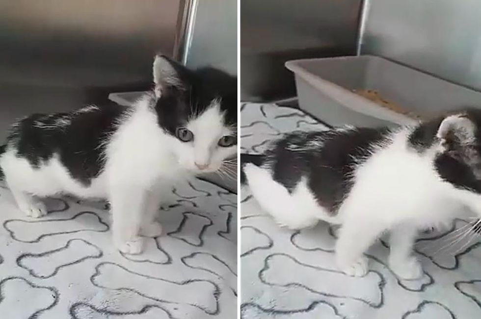 A little black and white kitten found himself at a pound in Montreal, Canada amongst other rescued cats. He had trouble using his hind legs when he tried to walk, and had to use his front paws to push himself forward.