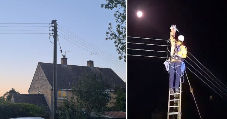 It’s not often that an entire town participates in the rescue of a cat. Although in this case, it wasn’t by choice. However I haven’t seen any news reports of residents in the Gloucestershire town of Stow-on-the-Wold complaining. It happened when a local family cat named Gryffyndor was discovered at the top of a live power pole! Sadly the family stated the RSPCA informed them they needed to wait 24 hours and then call emergency services. Gloucestershire Fire and Rescue and Western Power Distribution had other plans to avoid waiting that long. And after 8 hours of brainstorming, the safest decision for all involved was made.