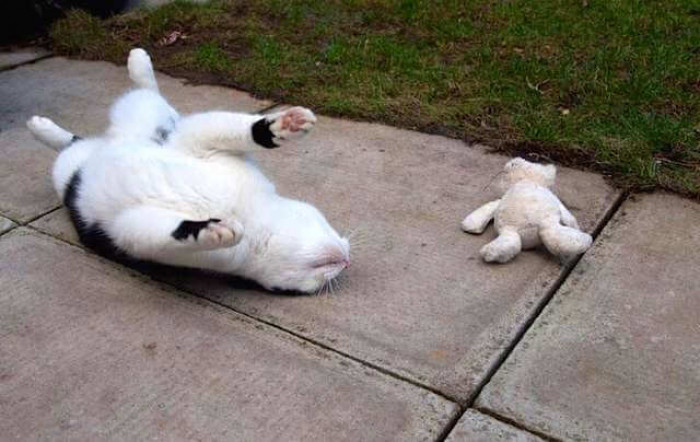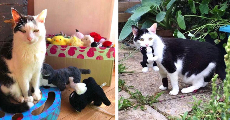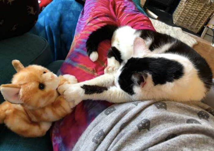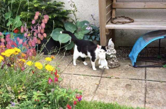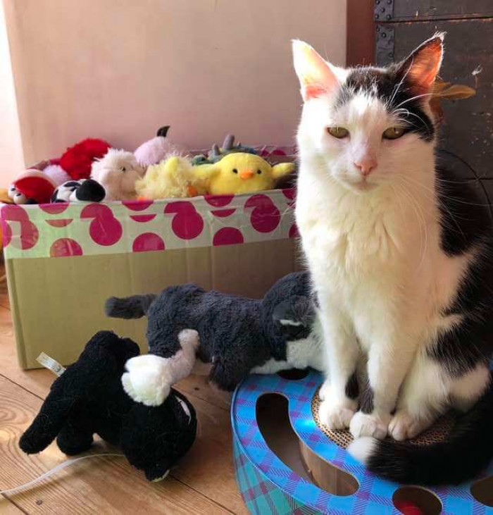 Meet Pixie, a beautiful 12 year old Tuxedo cat that lives with her human, Beth Wilson, in the UK. Like all cats, she loves going out and exploring everything around her. She is also in love with plush toys and inanimate birds and it would seem that she wants to share her little adventures with her toys too!