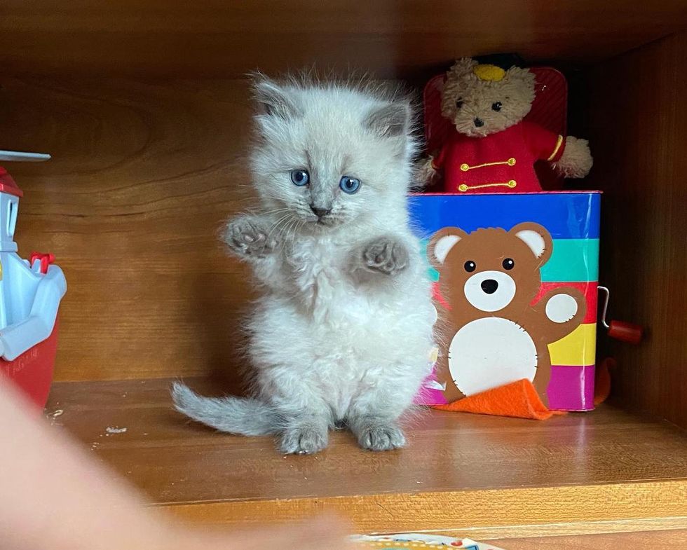 “Quentin (a blue colorpoint) was a big baby, and he absolutely refused to wean. He would yell at me for his bottle. Meanwhile, Tina (a tabby) had been eating from a bowl for a while,” Penny told us.