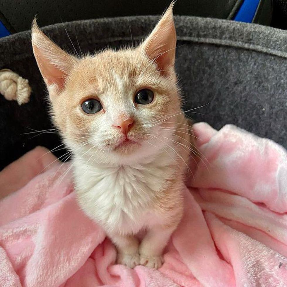 The kitten was safely taken into her care after a 2 1/2-hour ride. “He was dropped off at our house rolling around in this hand-made hat that the transporter had him in. His eyes were crusted shut and swollen red, yet he was so beyond happy despite his poor condition.”
