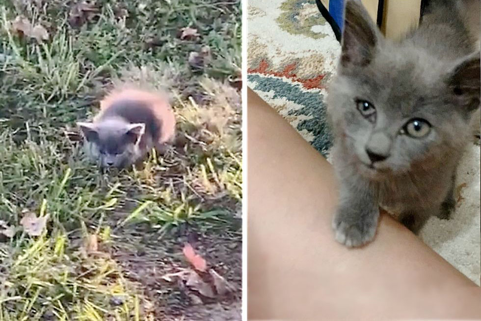 She could hear the cries as she approached the little ball of fur. When she got a closer look, she saw a tiny gray kitten all by herself, lying in the grass near the tree.
