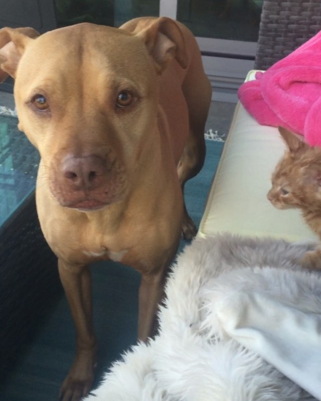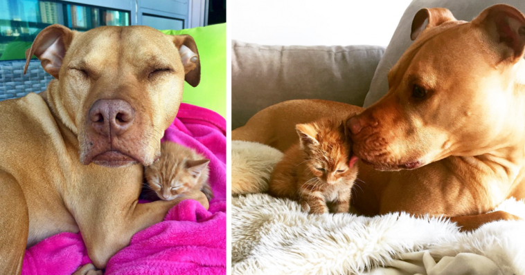 Bubba, the 6-year-old rescue pit bull, has always been obsessed with cats. It started when his human mom Rebecca Pizzello got him from a shelter in Phoenix, Arizona when he was just 3 months old. Her roommate was caring for a litter of kittens and Bubba just clicked with them. Finally, after 6 years of waiting, Pizzello surprised her mellow pit with his very own kitten.