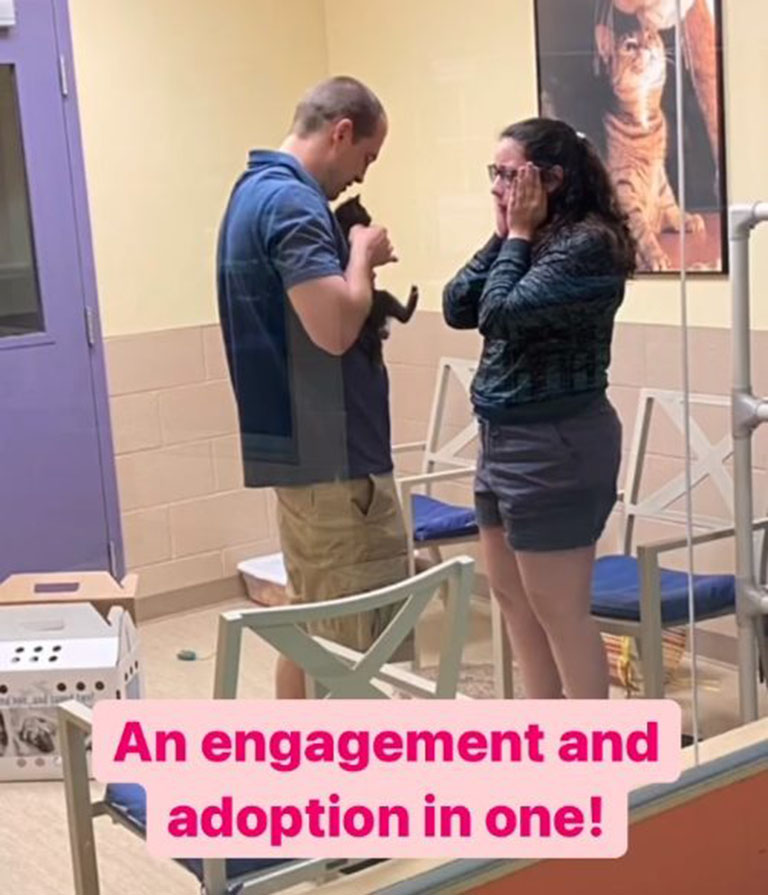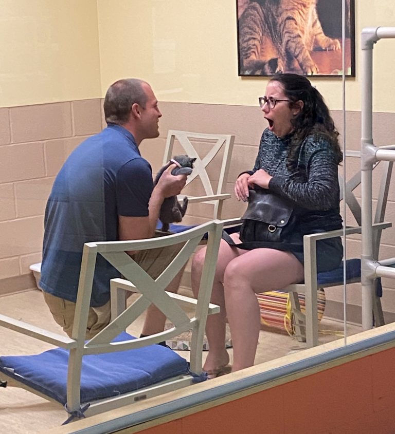 It’s always exciting at a rescue facility on adoption day. Volunteers and fosters happily see their charges off as they begin their next adventures. And in many cases, they are treated to photos and updates of the cats in their new homes. Seeing the smiles on the faces of the new family only solidifies that they made the right choice for a forever home. What doesn’t happen often is an extra surprise marriage proposal that accompanies the adoption!