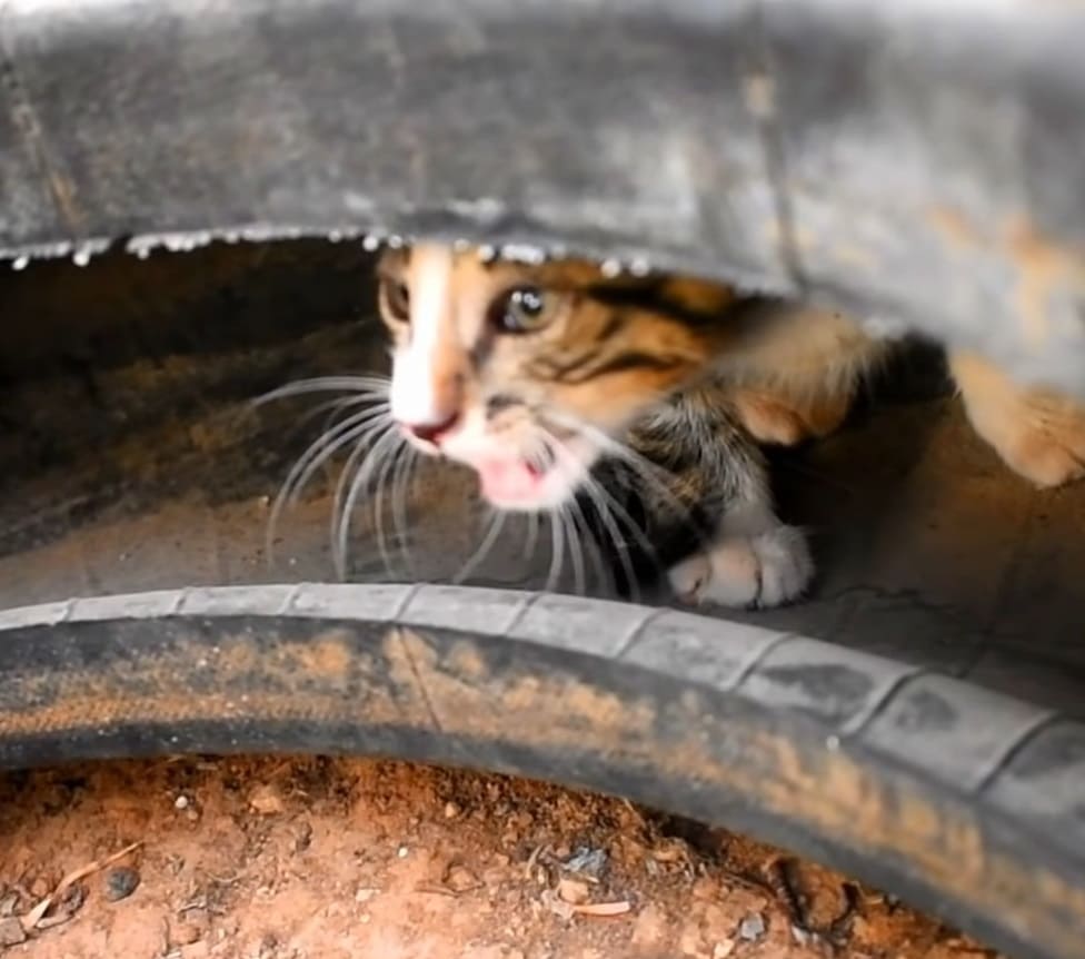 Everyone thought that the mama cat tried to protect her baby and lost the battle. The baby was scared and just knew to hide under old tires. He cried for help after witnessing his mom fighting with the huge dog. He lost his mom, so he was in need of help. One of the rescuers dismantled the tires carefully to catch him. He tried to do quietly to avoid frightening the kitten.