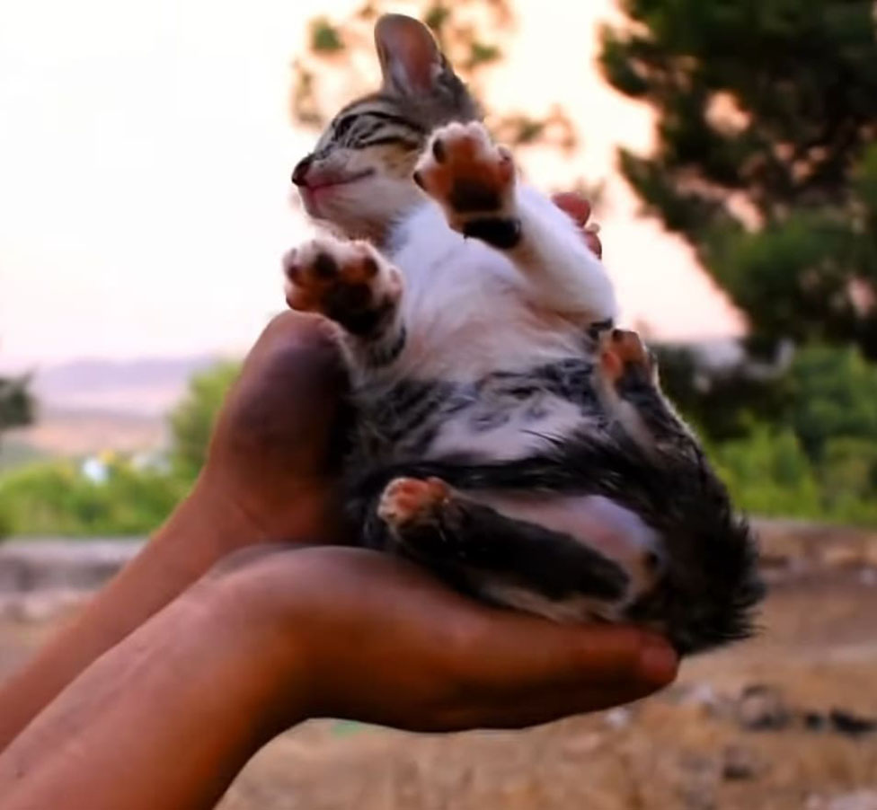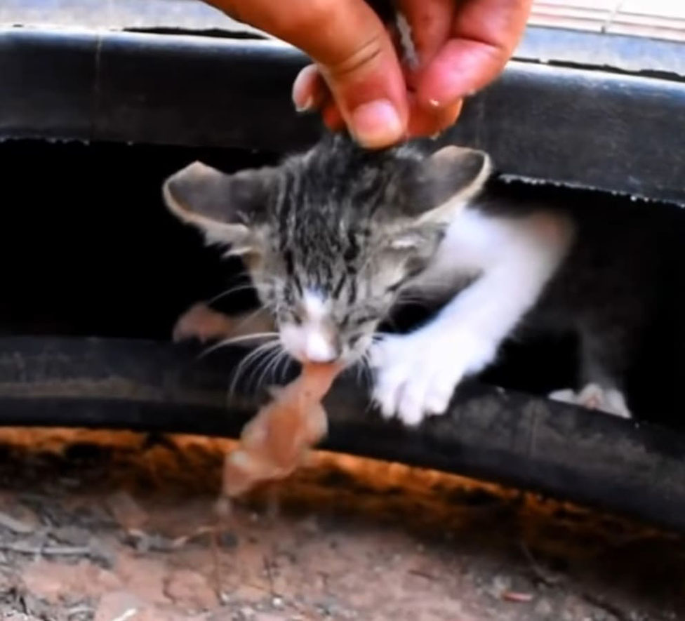 After removing all the tires, he tried to calm the kitten down and gave him food to fill his empty belly up. When the kitten felt comfortable, the man caught him and took him home. He cared for the kitten until he fell asleep, and then went to bury the mom. Rest in peace the mama cat.