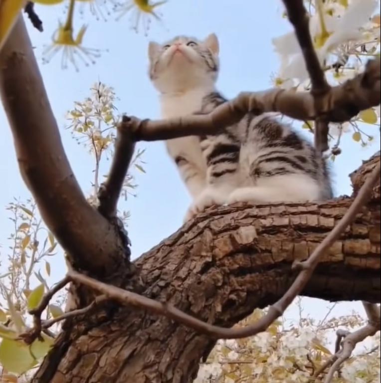 Once she begins to feel safer, she has no trouble discovering this brand new environment. The charming girl quickly climbs the trees like a pro though, she was born an explorer just like all the cats in this world!
