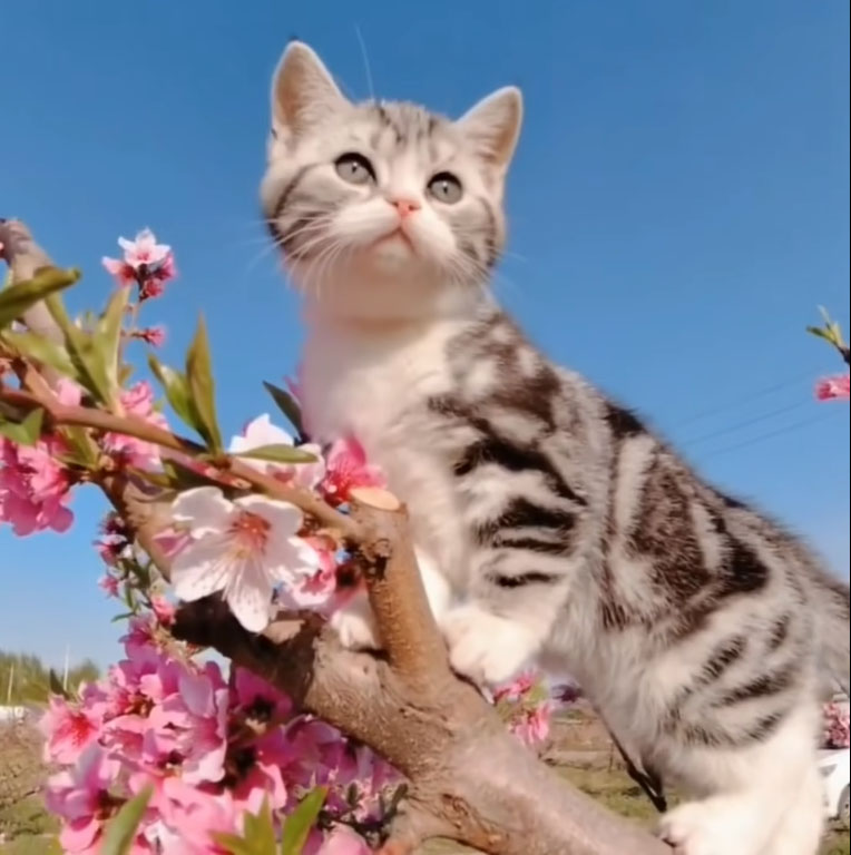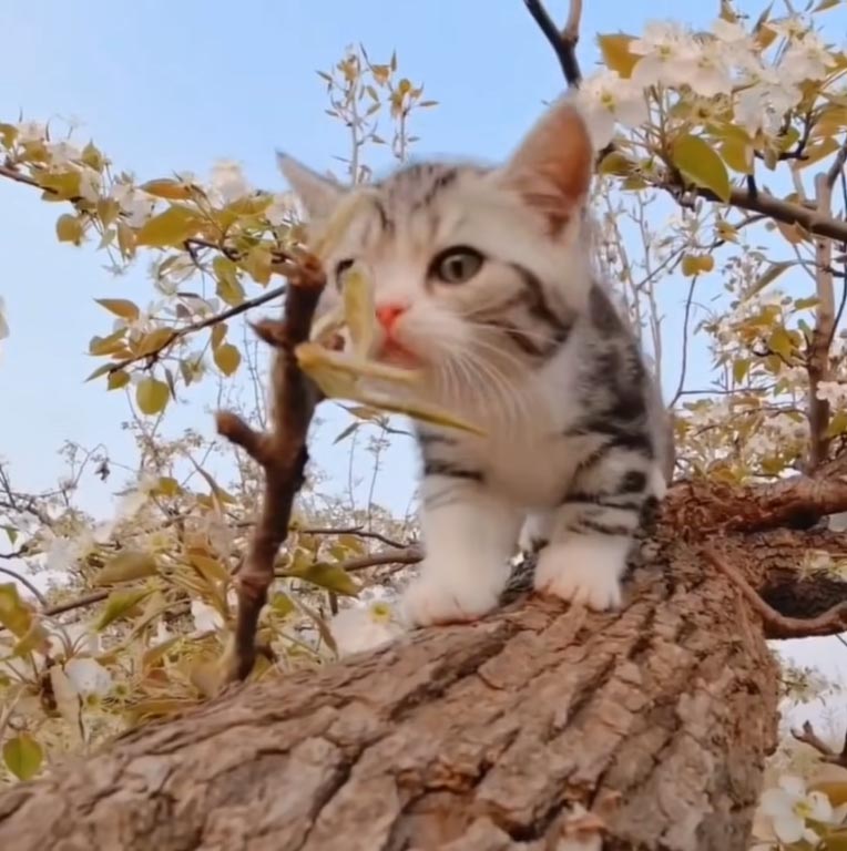 And the moment the young cat gets close to the peach blossoms, she curiously sniffs and even tries to taste some petals. To be honest, she looks like a charming and proud princess up there!