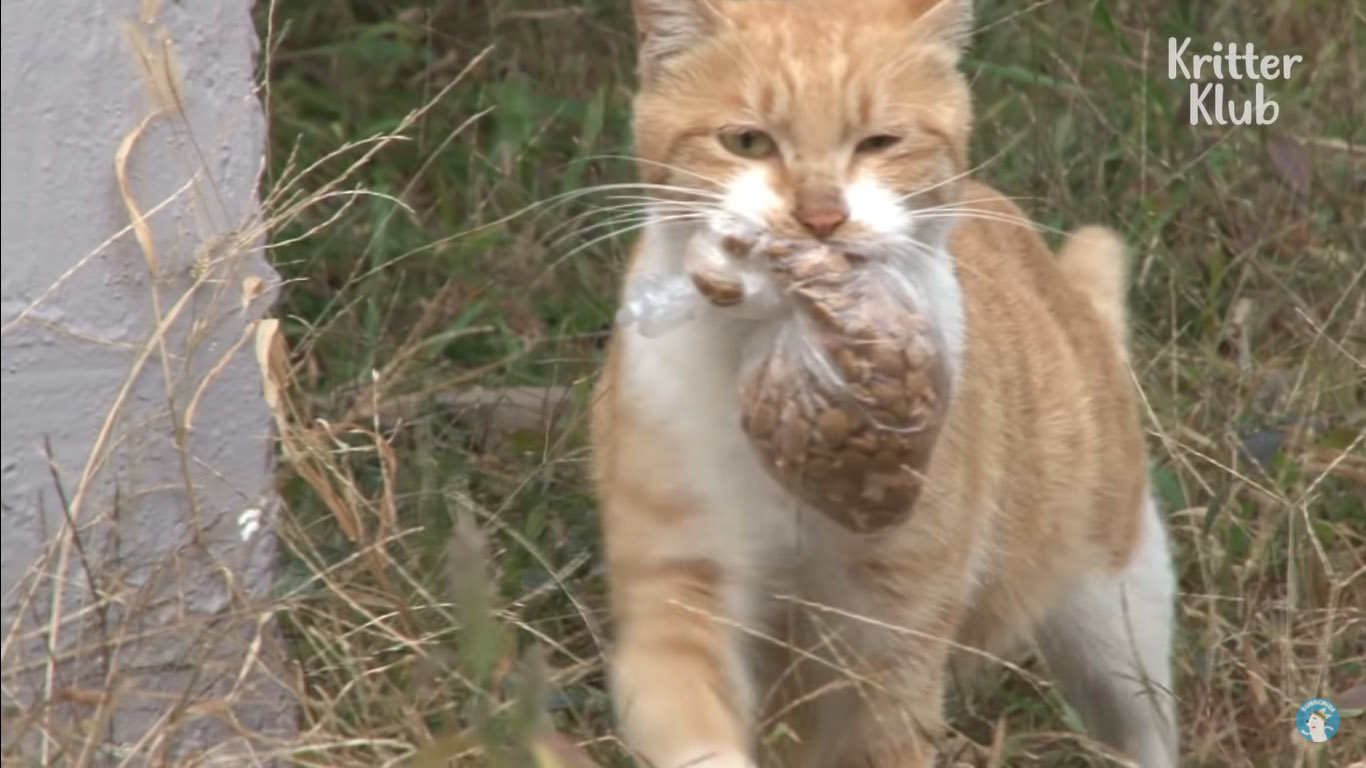 That kitty is known as the “food bag delivery cat” among the locals. No one knows where she goes or what happens afterward.