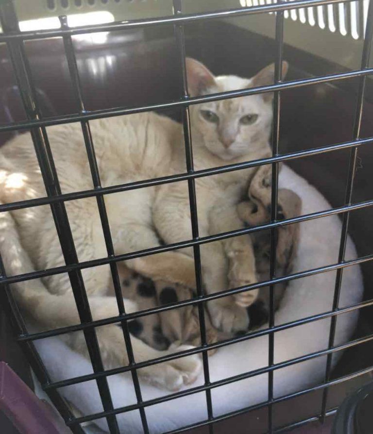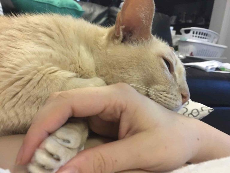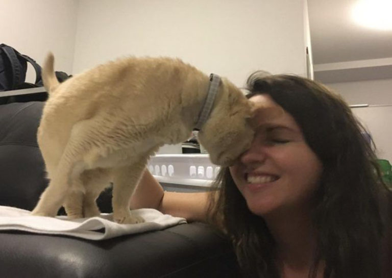 “He won’t leave my side,” said Sarah. “He is extremely affectionate, head-bumping and weaving around my legs. He likes talking to me at night and follows me around my apartment.”
