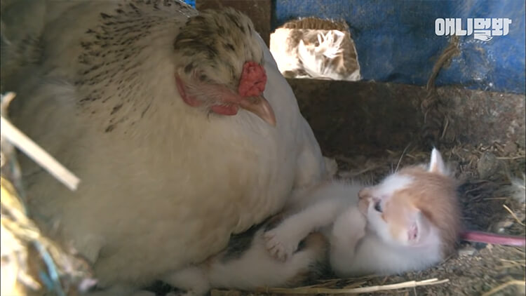 In fact, babysitting the kittens is not Kkokko’s only job, she also protects the whole cat family from the other three hens in the coop. Because Kkokko and the kittens already occupy the laying house, the rest of the gang hasn’t been able to lay eggs properly lately. Of course, with Kkokko guarding the house 24/7, they couldn’t do anything with these tiny kittens either.