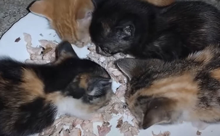 When the rescuer arrived, he noticed the kittens inside a bag near the garbage. They looked weak, scared, and desperately needed help. When the rescuer touched them, the kittens became angry to defend themselves. The man reassured them with caressing and waited for them to calm down. At home, the four kids were given boiled chicken and water. As they felt hungry, they finished the meal quickly. Looking at them, the rescuer felt happy as they were stronger and sweeter than he thought.