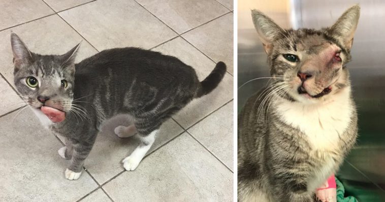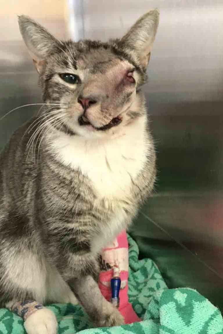 A very brave cat with an enormous tumor on her face never gave up. Rescuers saved her from being euthanized and helped her restore her smile.