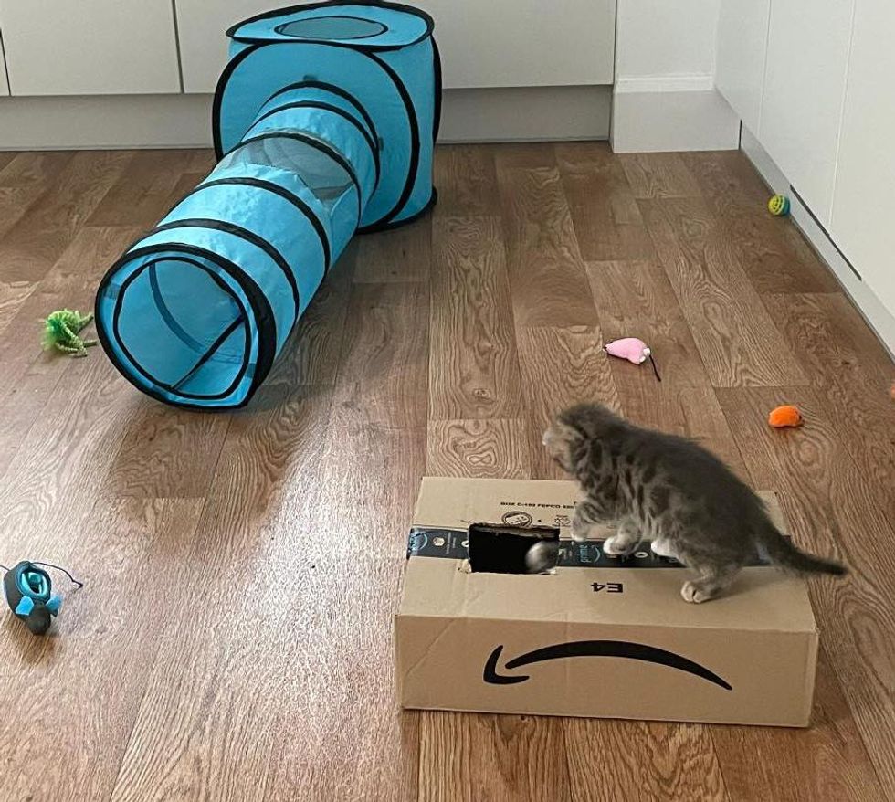 Instead of playing with the assortment of cat toys, the tabbies are more drawn to the cardboard boxes and have turned them into tiny fortresses.