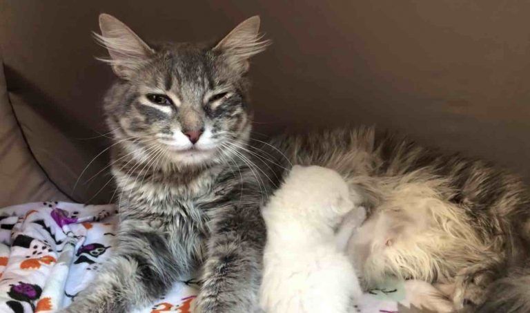 This beautiful gray tabby was surrendered to an animal shelter when she was pregnant and one morning when the staff arrived they discovered that she had given birth to two kittens.