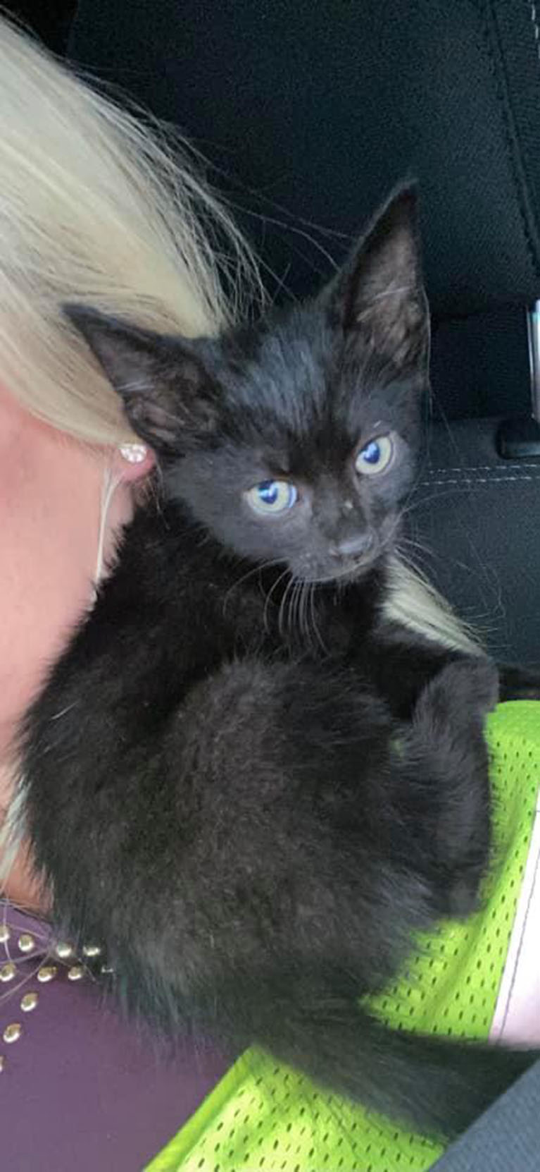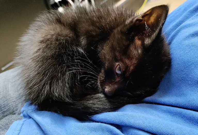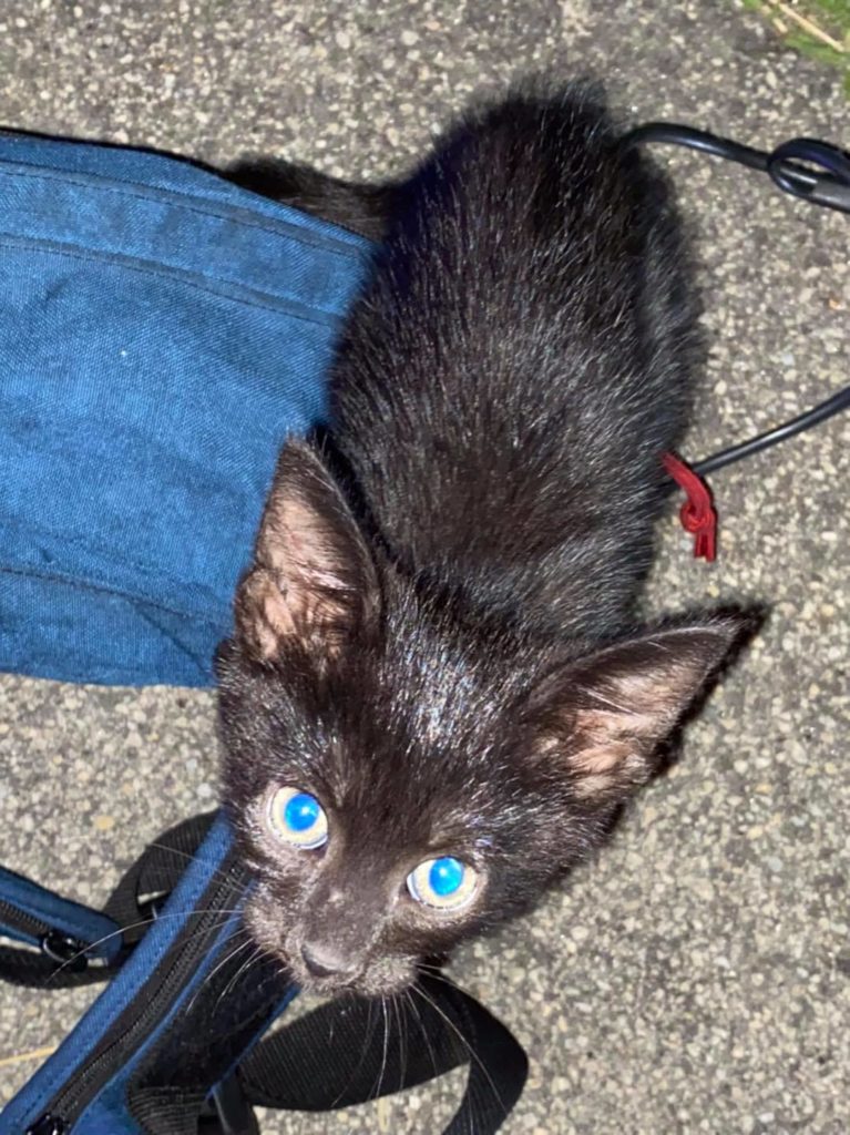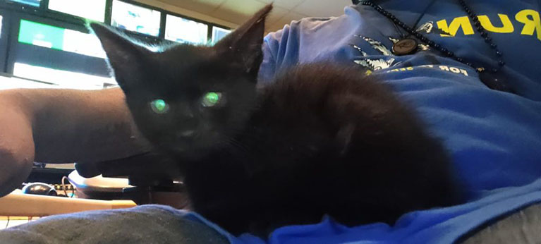It was a tiny black kitten at the scene who took charge and got herself adopted!