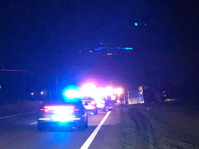 When Courvell arrived, there was a semi truck that had overturned and was blocking the roadway. Flashing blue and red lights shown through the rainy darkness as crews shouted to each other. And there was fuel leaking all over the roadway that had to be cleaned up before anything worse occurred.