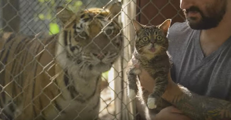 The video below shows the fateful meeting between Bub the cat and two of his feline cousins – tigers. At first the tigers were curious and wary of Bub and were just checking him out. Pretty soon, the tigers were all chummy and eager to get closer to the cat. Bub, however, had other plans.