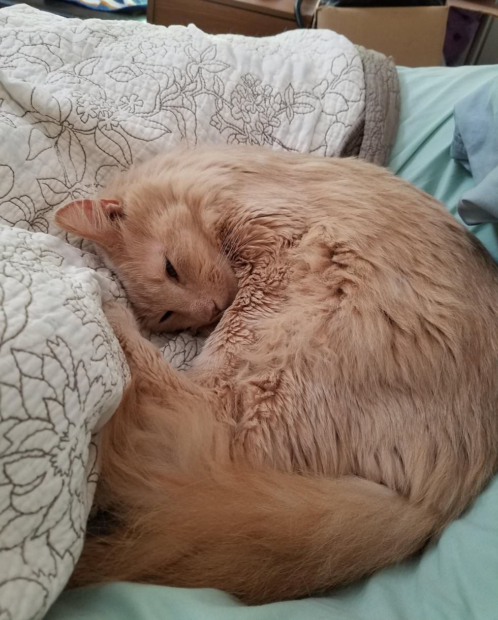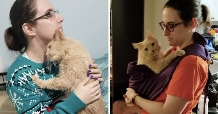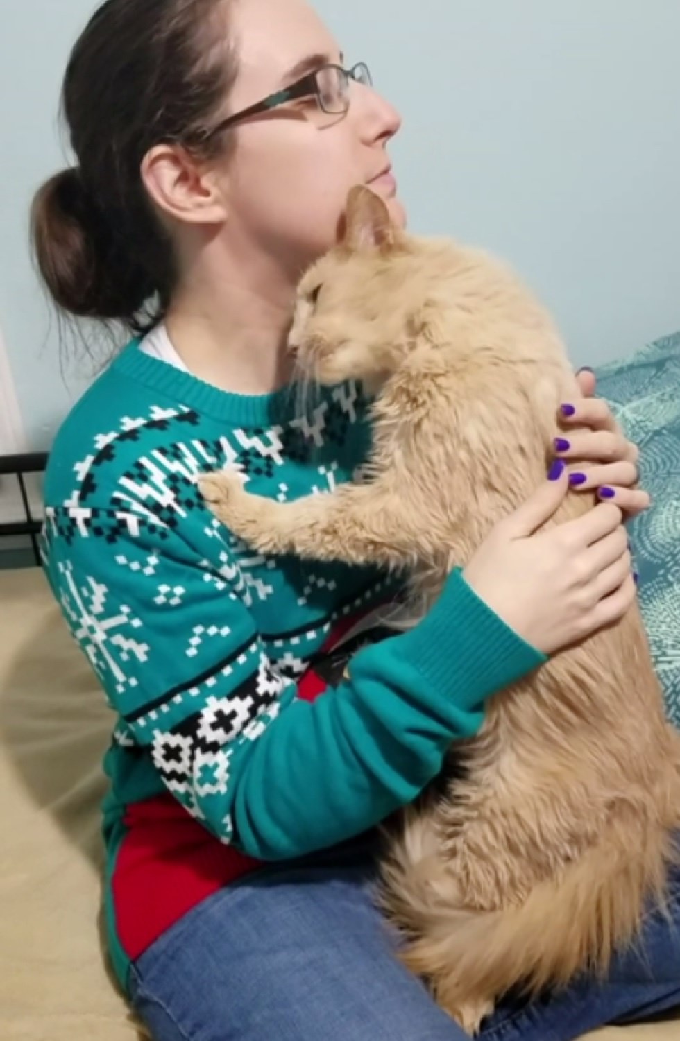 A cute little shelter cat gave Dan and his wife from North Carolina a gigantic hug, and then didn’t want to let go. This happened when the couple adopted the cat and named him Huggs.