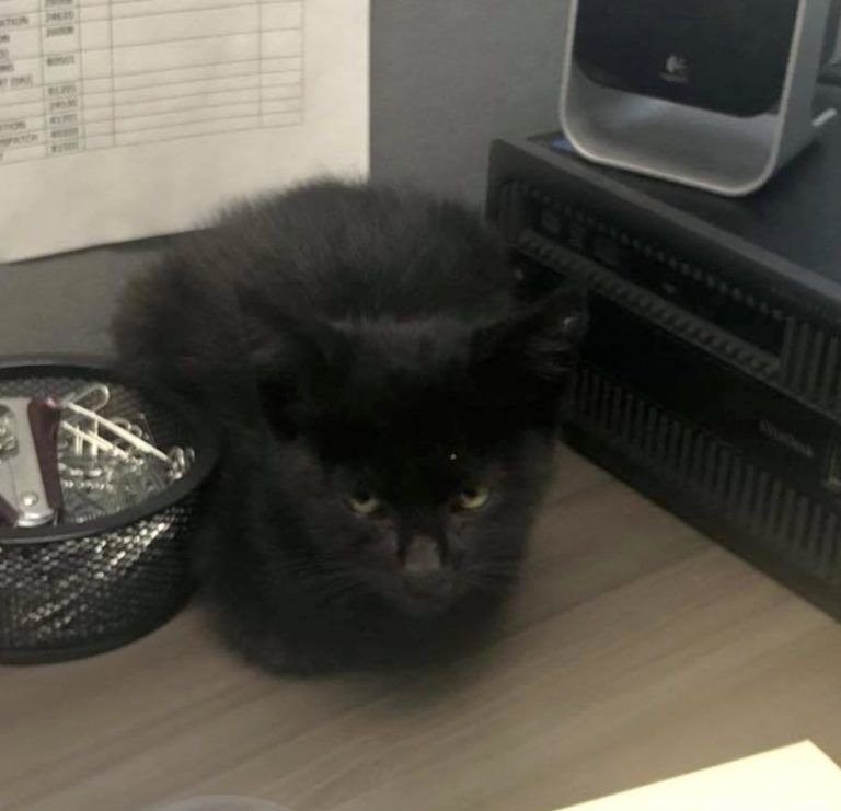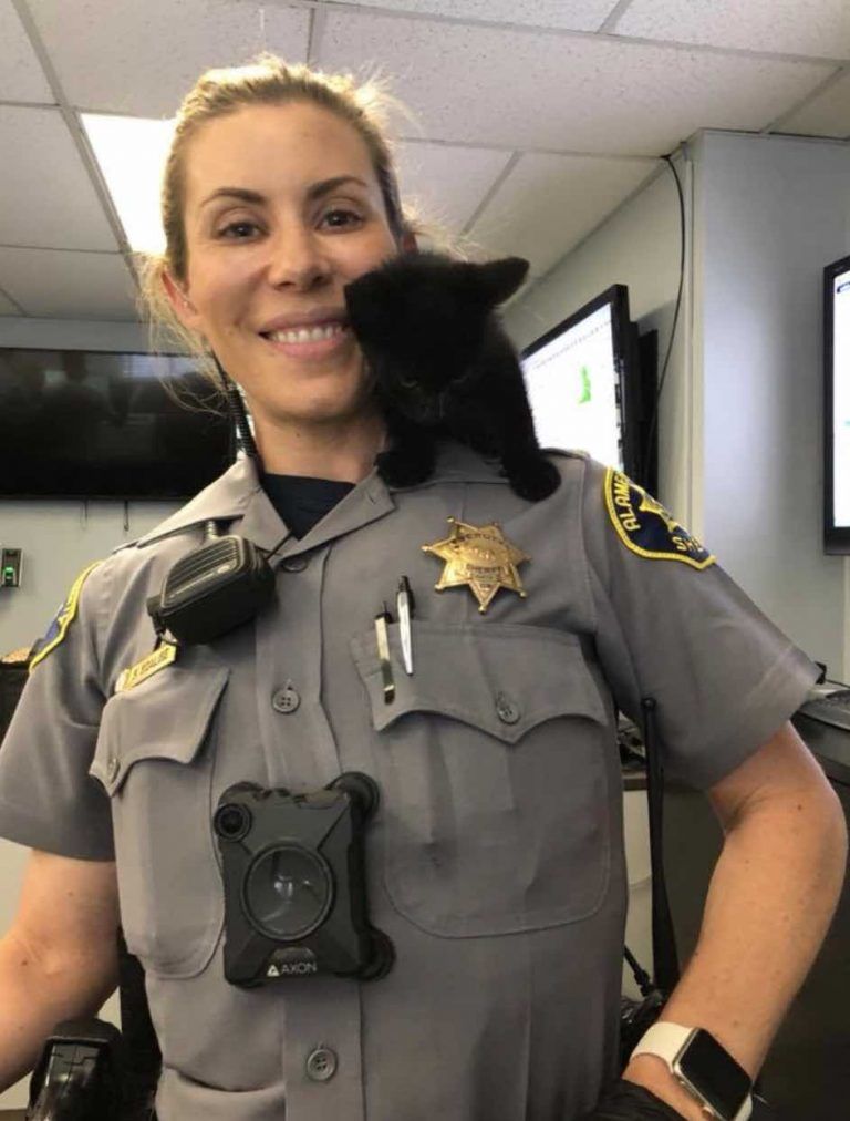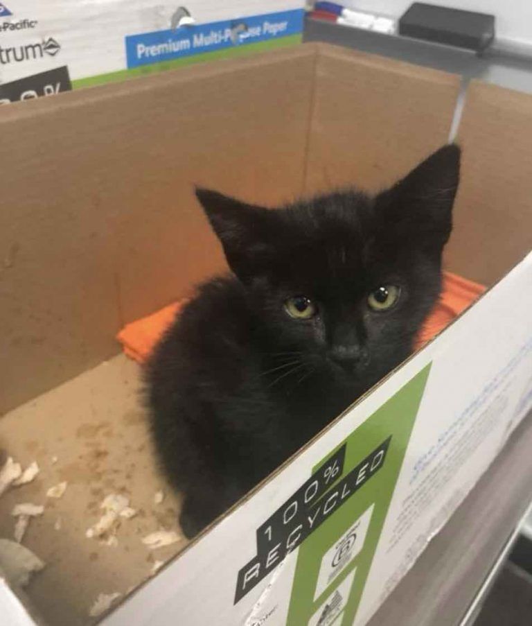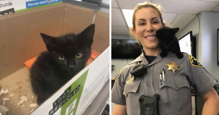 One day a little black stray kitten appeared outside of a police station in Eden Township, California.
