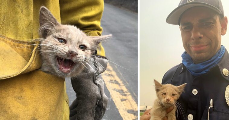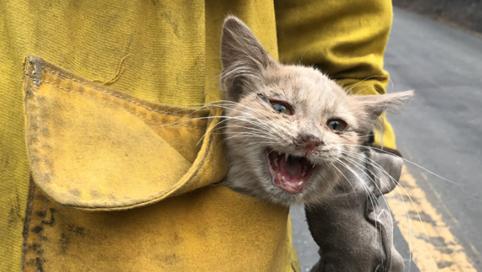 A much better tale of California firefighters fighting a wildfire that managed to rescue a cat. For what they do, thank these heroes Firefighters save lives every day and Thursday was no different. In Northern California, though, a firefighter who helped defend homes where flames burned took time to save a tiny life, a frightened kitten who survived the Bear Fire