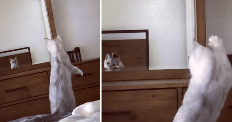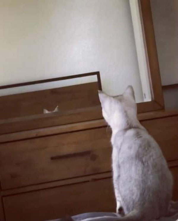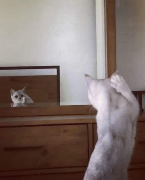 Have you ever looked in the mirror and your reflection simply shocked you? A cat has just discovered that it has pointy little ears when it saw a glimpse of itself in a mirror. The adorable kitten was thoroughly confused with its own appearance.