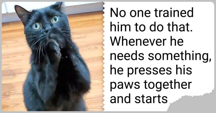 Waddy is the literal definition of a beggar when it comes to his favorite food, and to get his owner’s attention, the black cat presses his paws together and waves them until he finally gets his reward