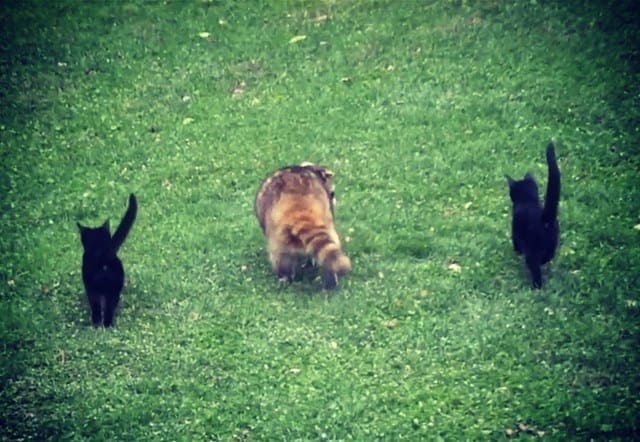 The blind raccoon assisted the cats in finding a loving home, and they now live happily with another feline friend, Squirt. We sometimes wonder if they remember Mr. Racoon from their kittenhood…