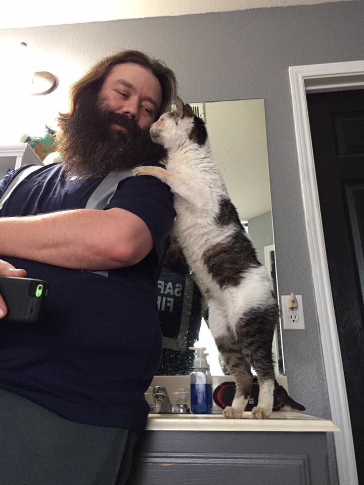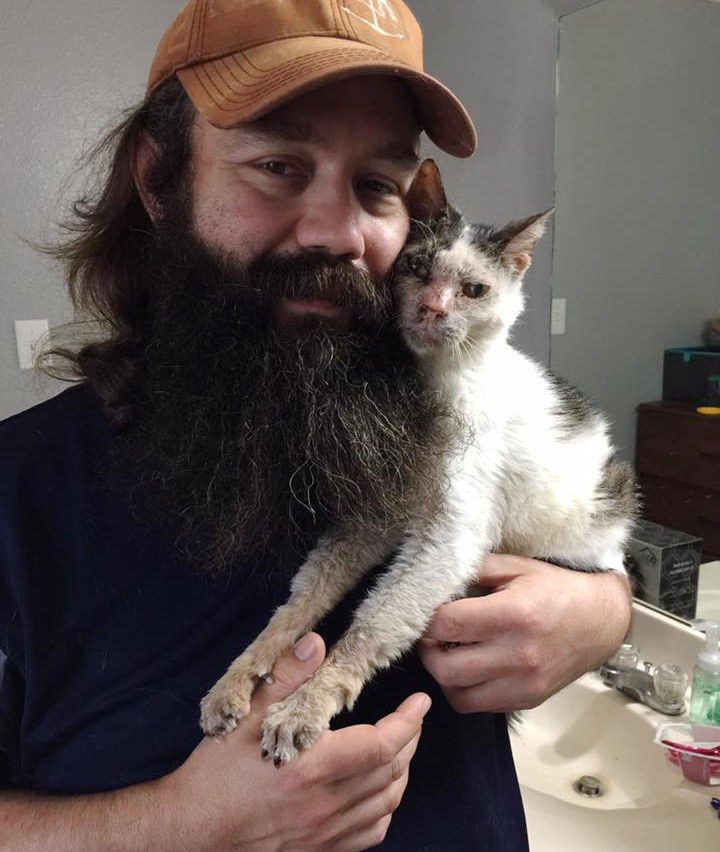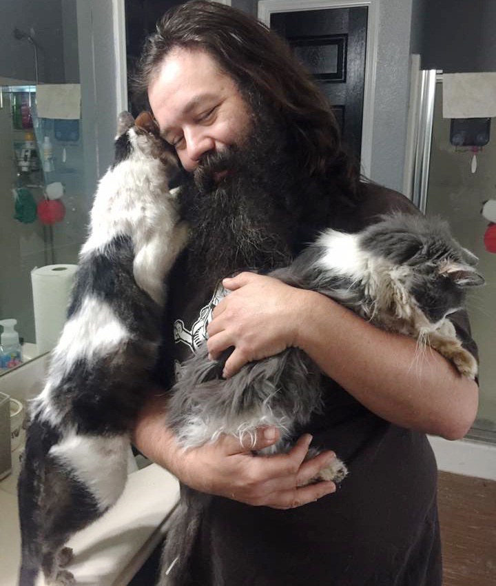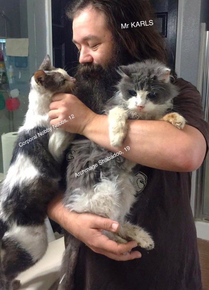 While cradling Archmage Shabadoo in his arms, Nobbs wants hugs from his human father. “We take in cats with any existing aliments, those that can be adopted usually find loving homes and those that can’t, live out their lives with us in comfort.”