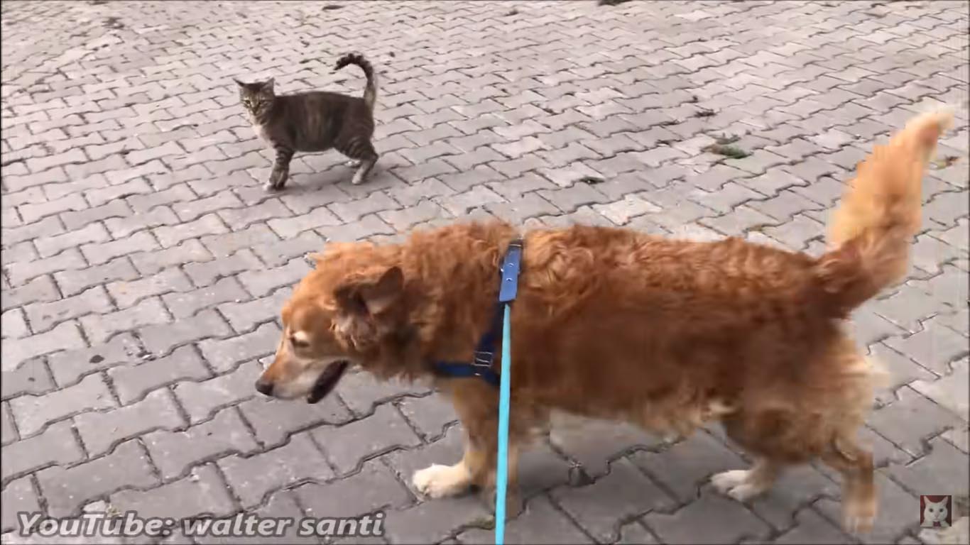 After the guy fed her once, the attention-seeking stray began following him and his dog everywhere they went on walks. The friendly golden retriever and the loving cat established a deep relationship.