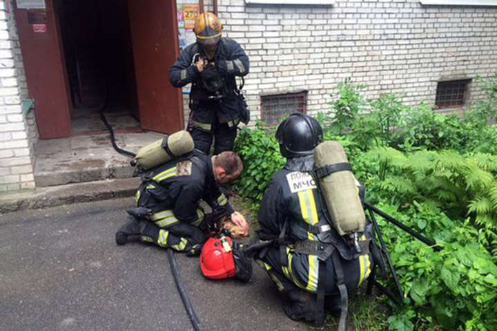 As an apartment in St. Petersburg, Russia, burned down, firefighters tried to put out the blaze. When the environment was clouded by smoke, firefighters saw a cat that was choking on smoke and was trying to jump from the balcony.